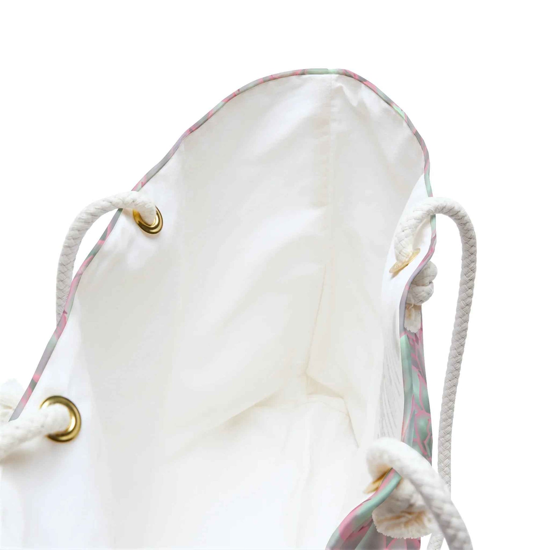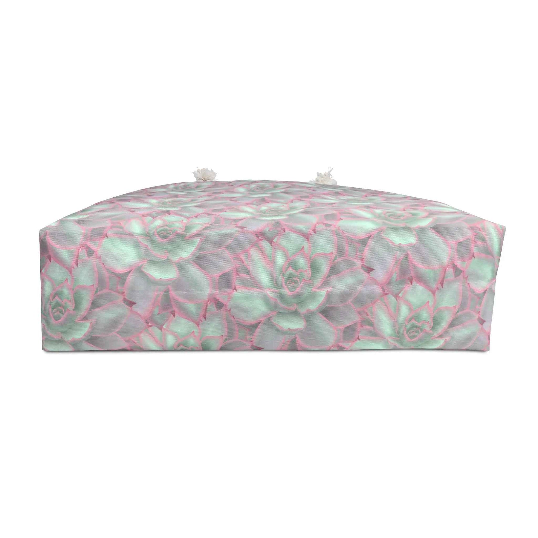 This botanical print tote showcases a hand-drawn rosette succulent design inspired by the Echeveria Violet Queen, known for its violet-pink tips that appear in cold weather. The all over print tote features thick, durable rope handles for comfortable carrying and easy handling. Its wide mouth opening allows quick access to your belongings, making it an ideal weekender travel bag.