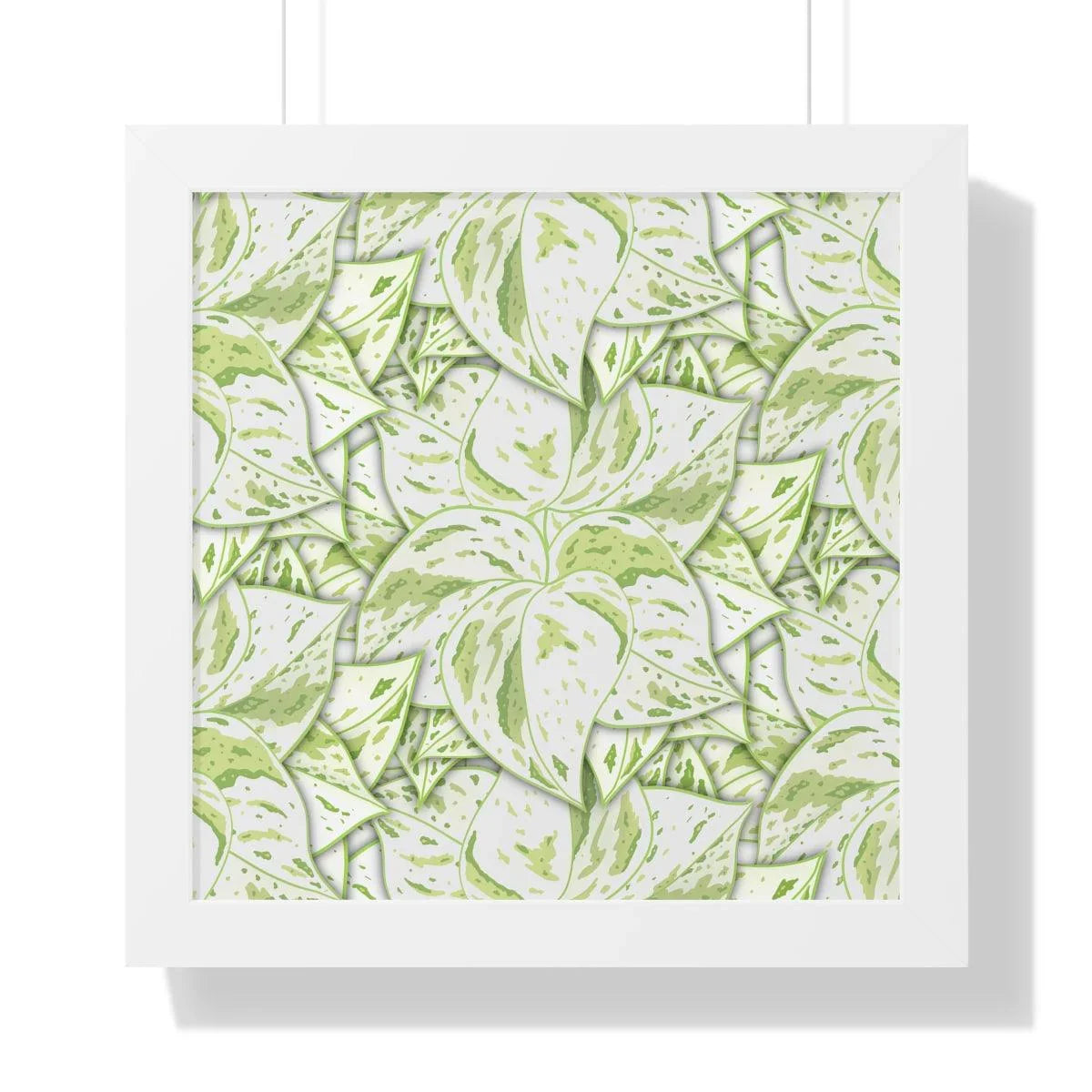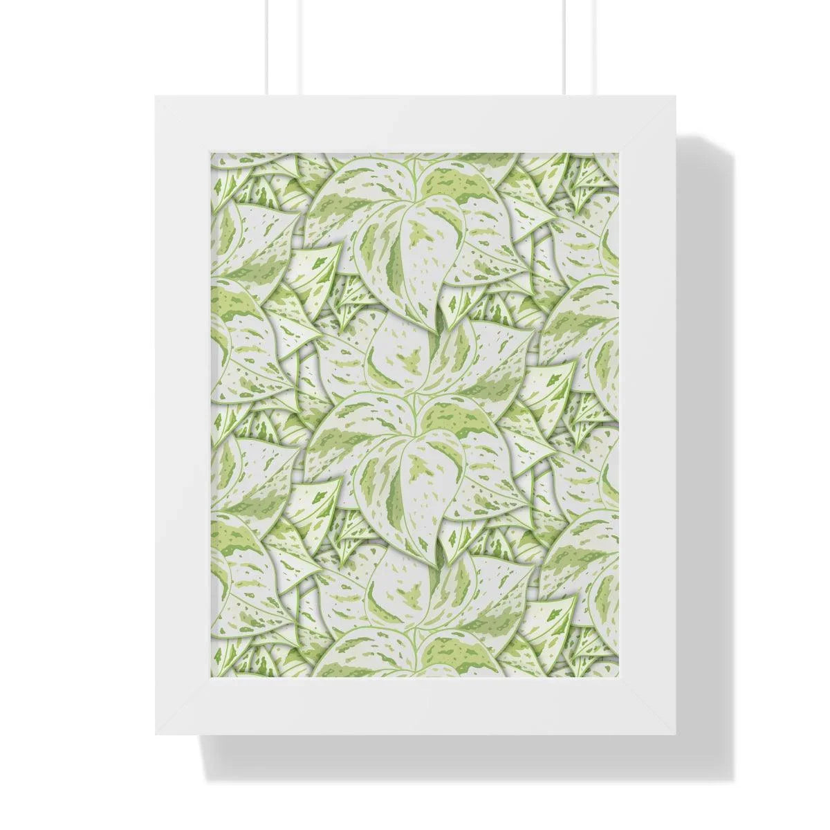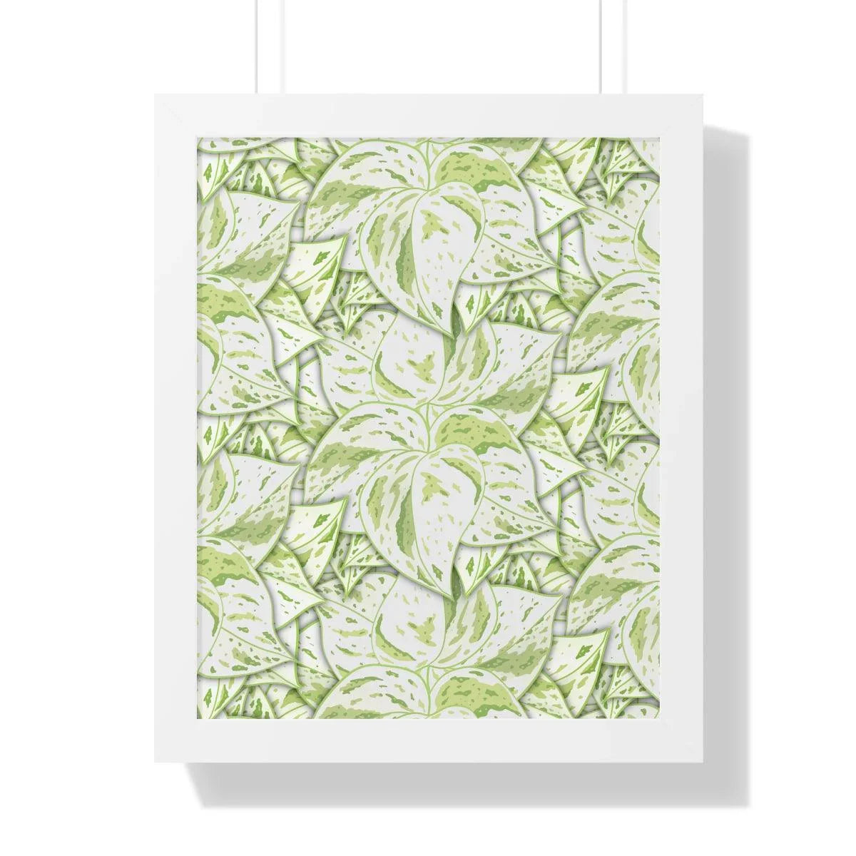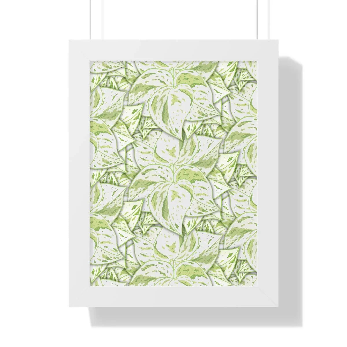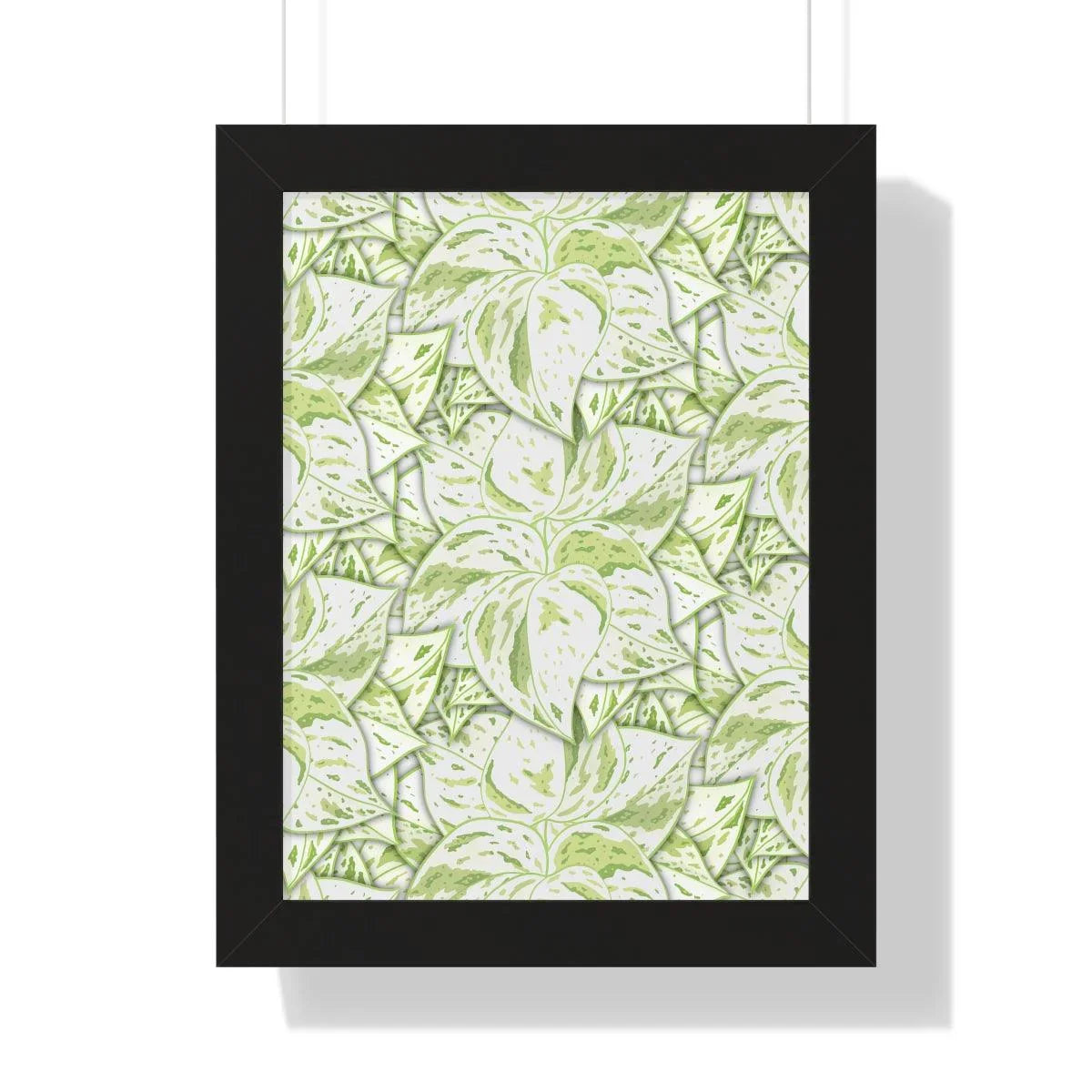 The Snow Queen Pothos print showcases the stunning variegated leaf artwork of the Snow Queen pothos plant, celebrated for its pure white foliage accented with delicate green splashes. This framed botanical art captures the translucent quality of the leaves, resembling a frosty windowpane, perfect for adding a serene touch to any indoor space. Printed on premium 200 gsm matte paper, this indoor plant poster combines high-quality materials with artistic detail to elevate your houseplant wall decor.