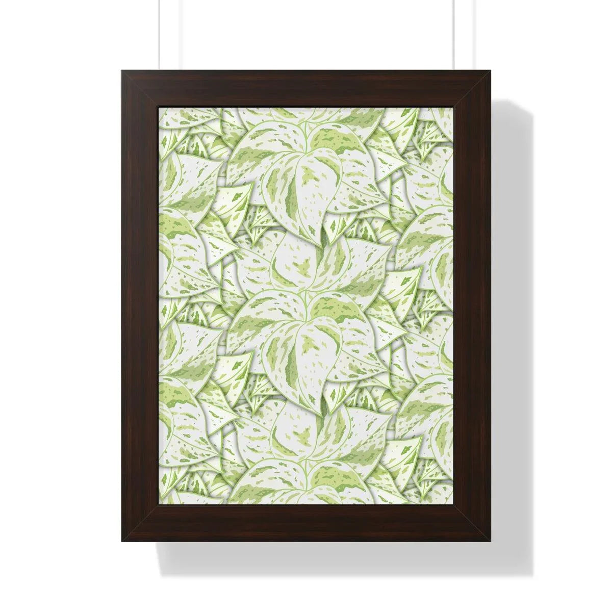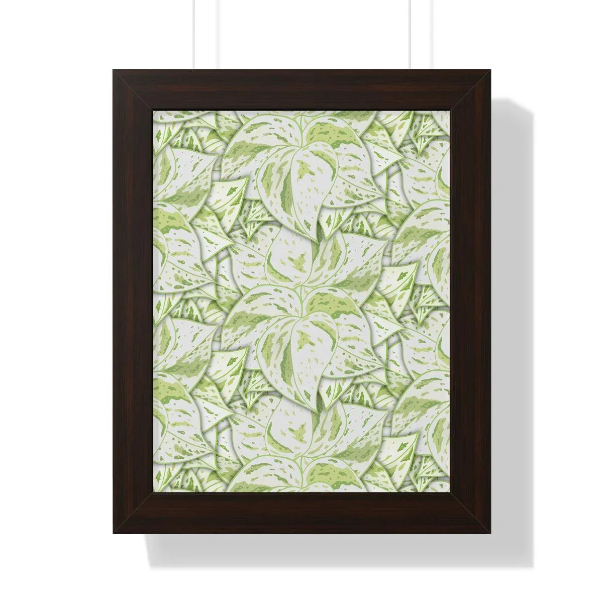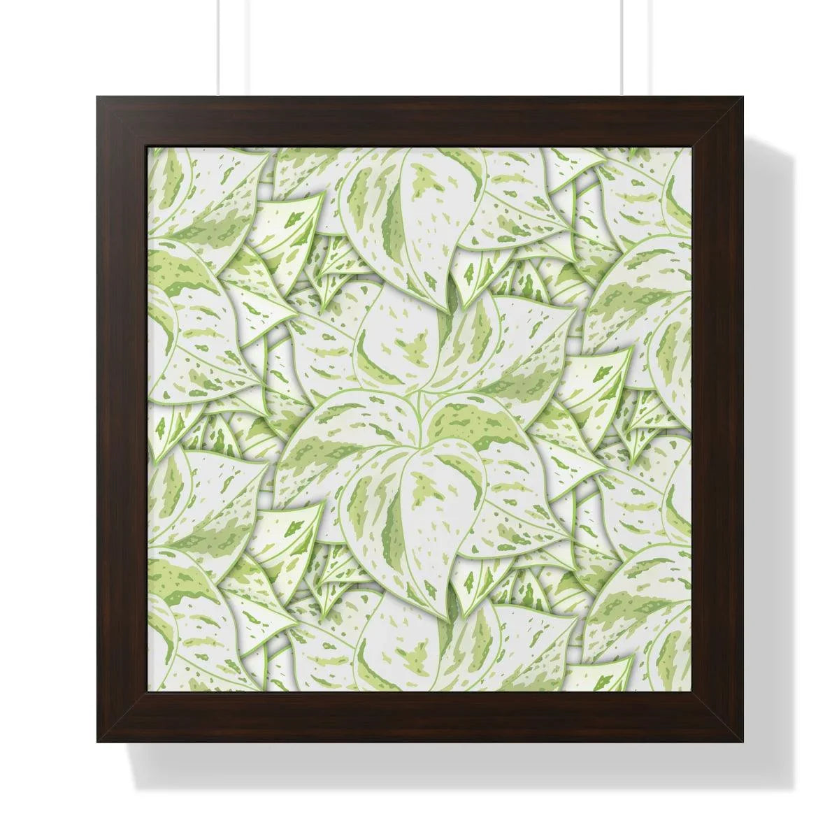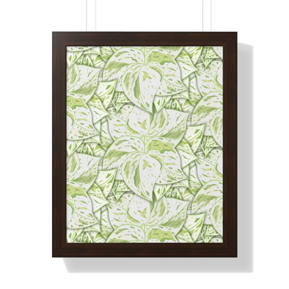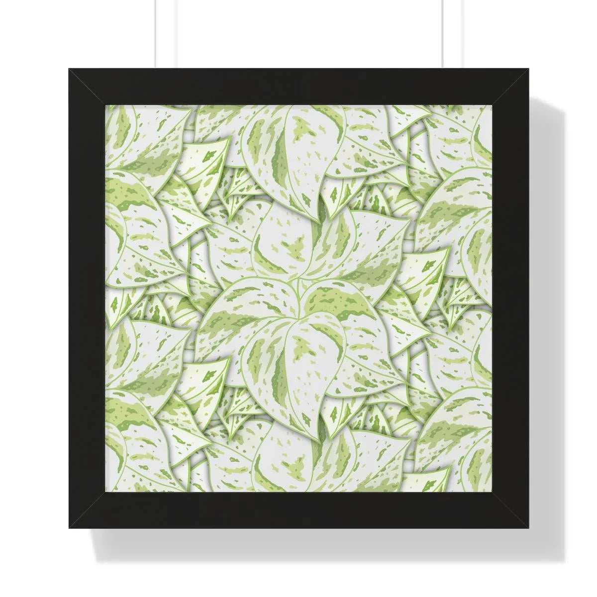 The Snow Queen Pothos print showcases the stunning variegated leaf artwork of the Snow Queen pothos plant, celebrated for its pure white foliage accented with delicate green splashes. This framed botanical art captures the translucent quality of the leaves, resembling a frosty windowpane, perfect for adding a serene touch to any indoor space. Printed on premium 200 gsm matte paper, this indoor plant poster combines high-quality materials with artistic detail to elevate your houseplant wall decor.