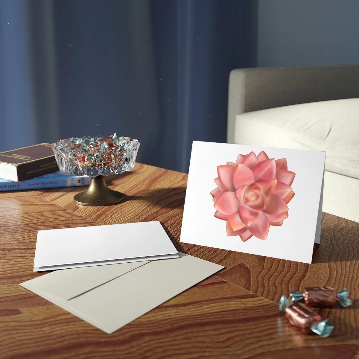 This succulent greeting card features the stunning Graptosedum 'California Sunset,' showcasing a vibrant rosette with colors that shift from pink and peach to burgundy and purple. Designed as a plant greeting card, it brings the warm hues of a west-coast sunset into your correspondence while offering a blank succulent card interior for your own message. Measuring 4.25” x 5.5”, these colorful succulent cards are printed on robust, uncoated cardstock that protects against damage during long-distance shipping. Each pack includes size-matching white envelopes, available in 8, 16, or 24-card sets.