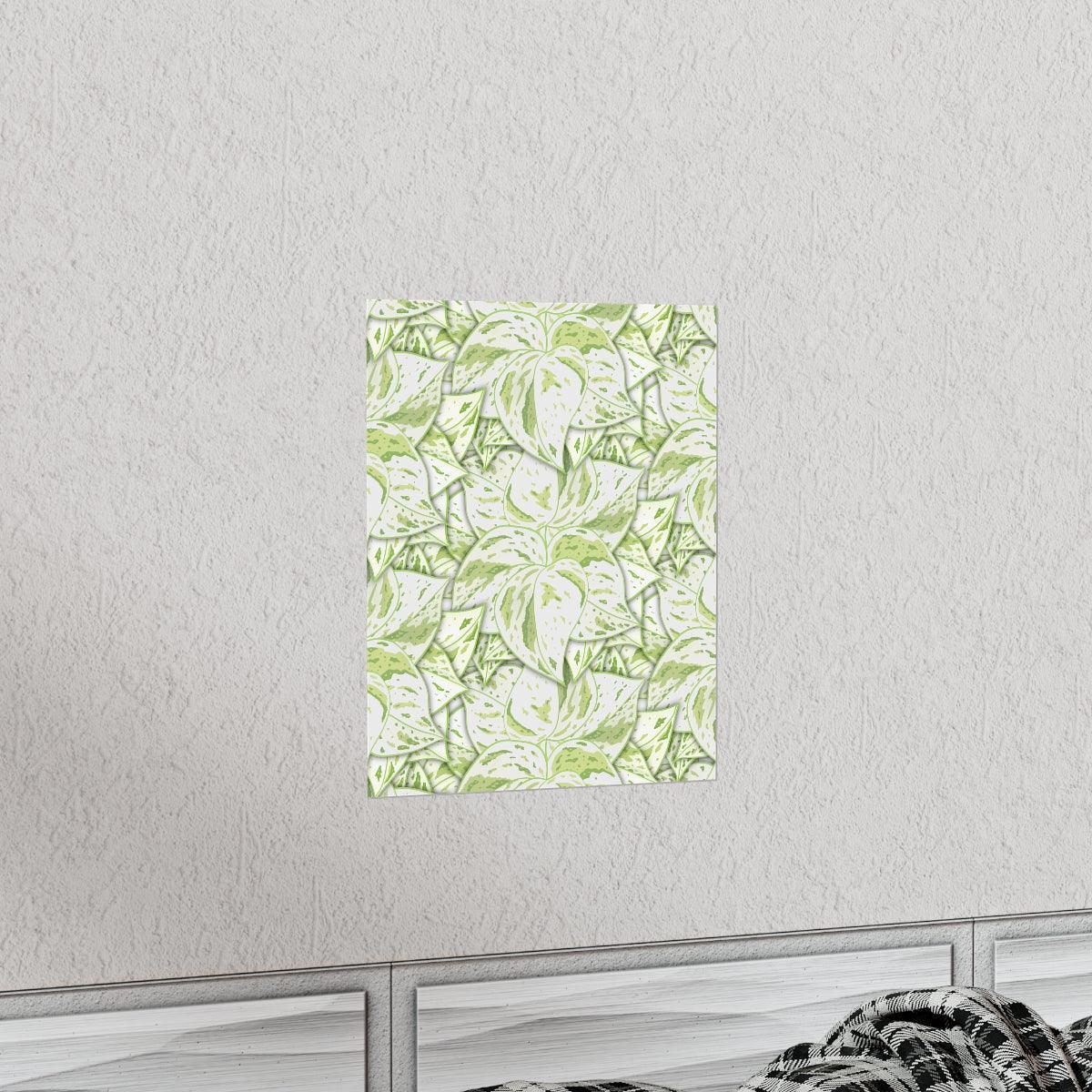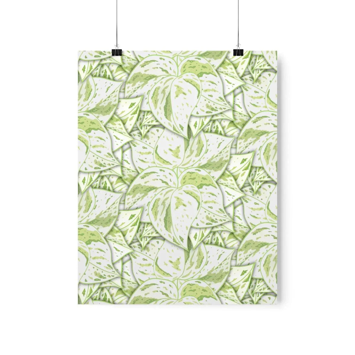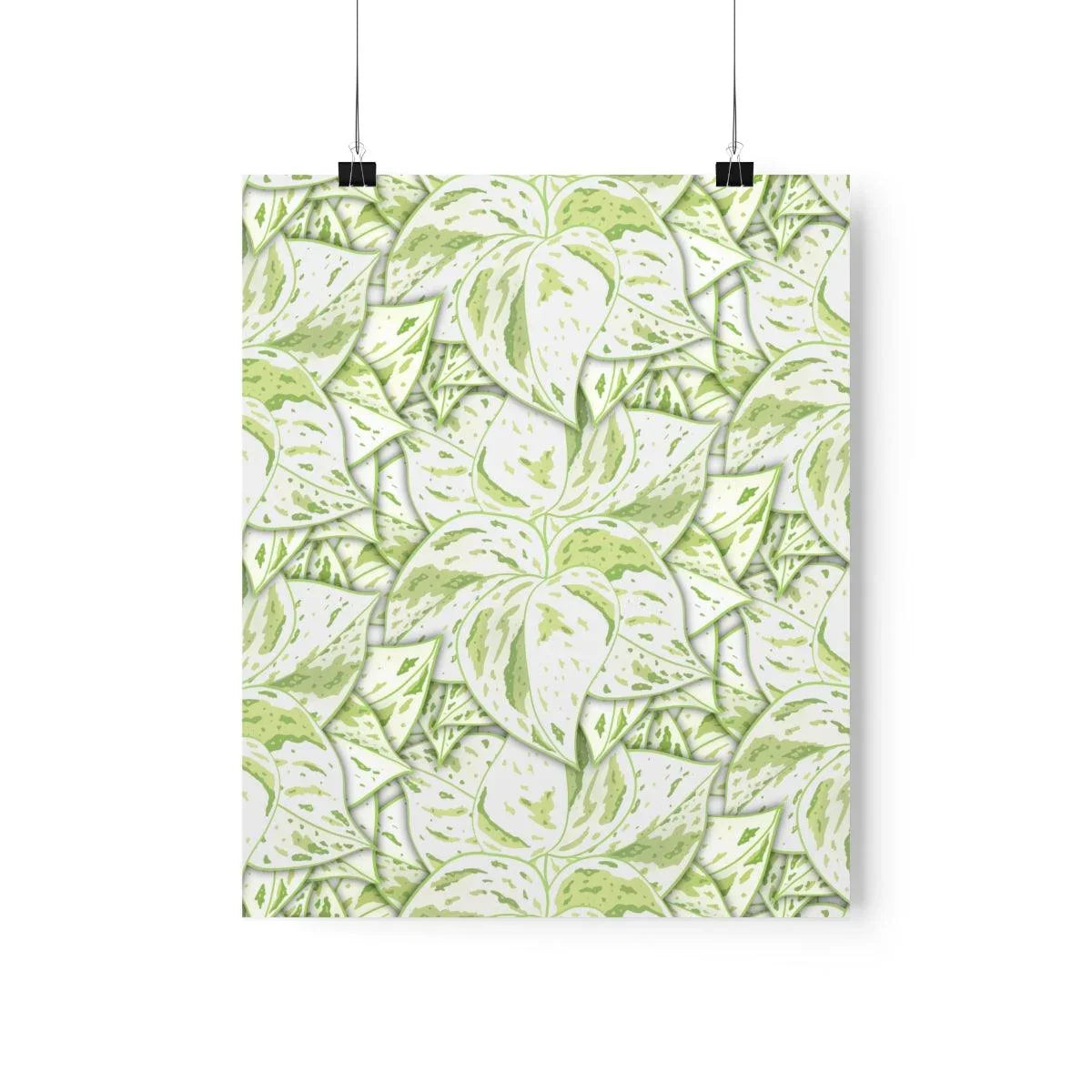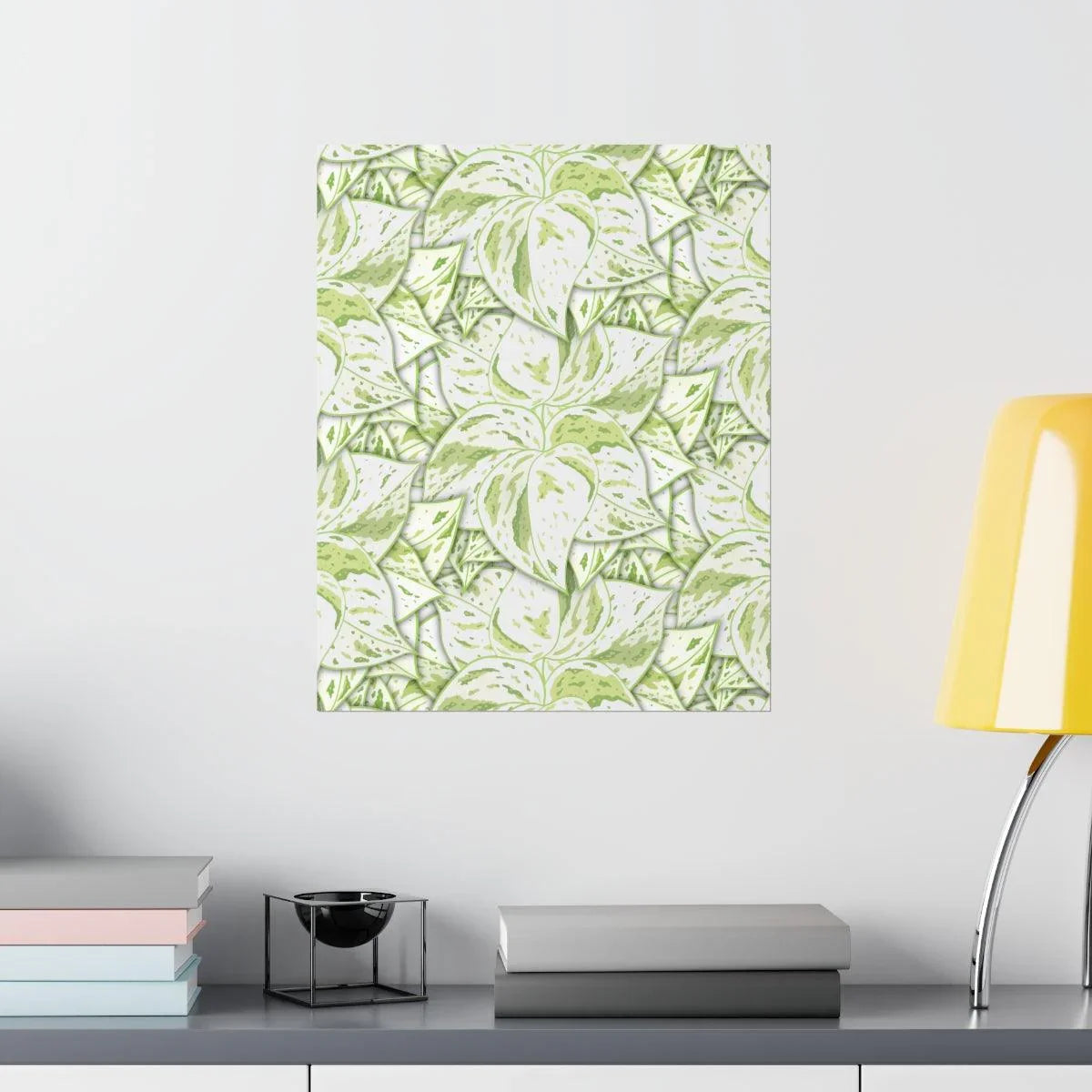 This variegated pothos print features a matte finish poster surface that reduces glare and enhances the intricate details of the white foliage artwork. Available in multiple sizes, the print's precise dimensions may vary slightly by +/- 1/16", reflecting careful production standards. The archival ink poster resists fading, preserving the crispness of every leaf and splash of color over time.