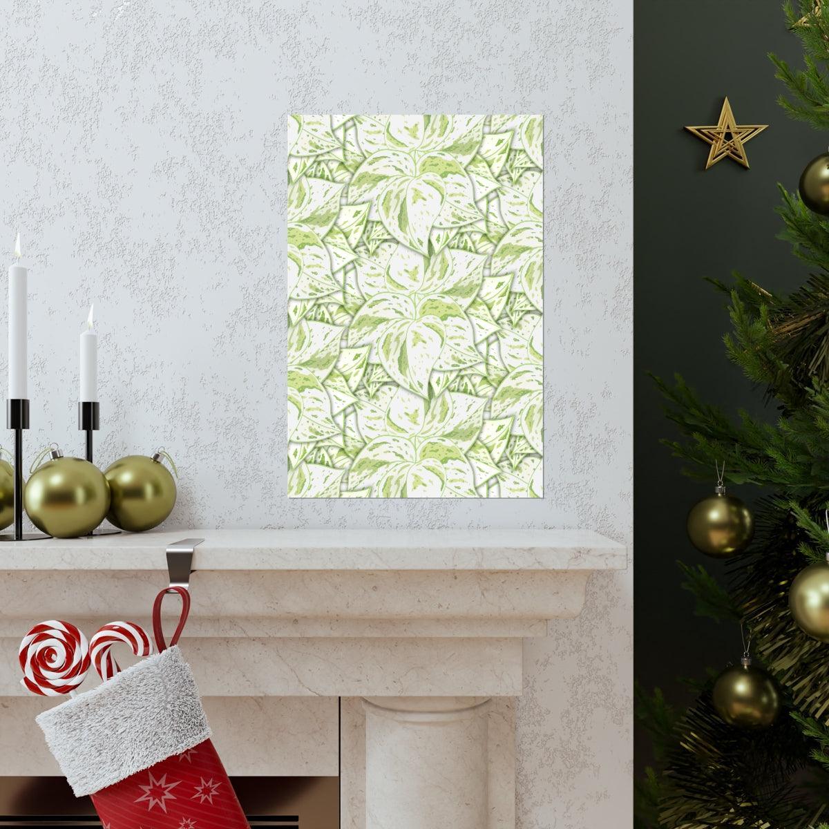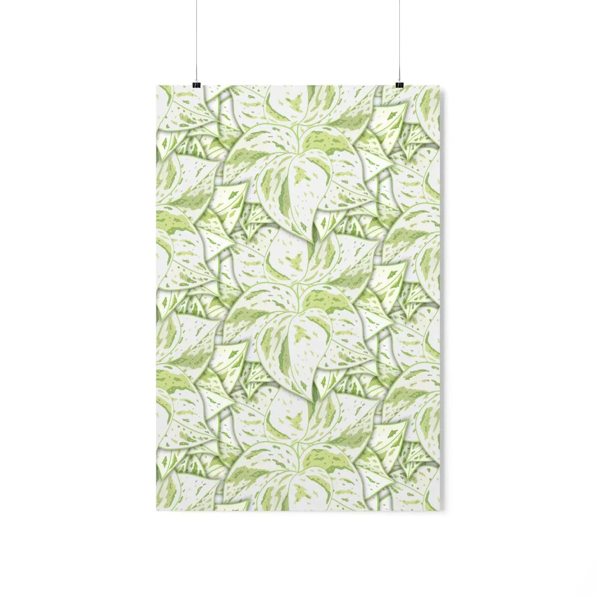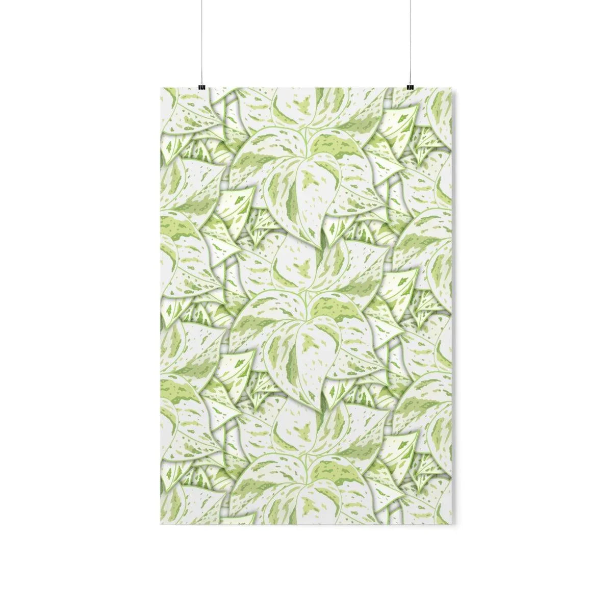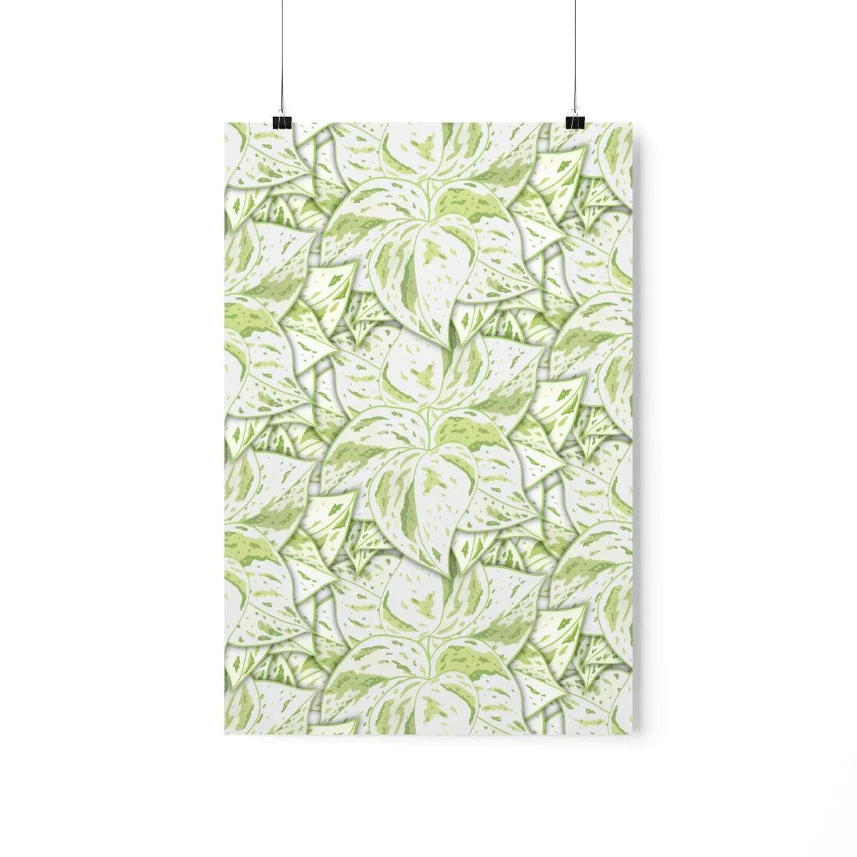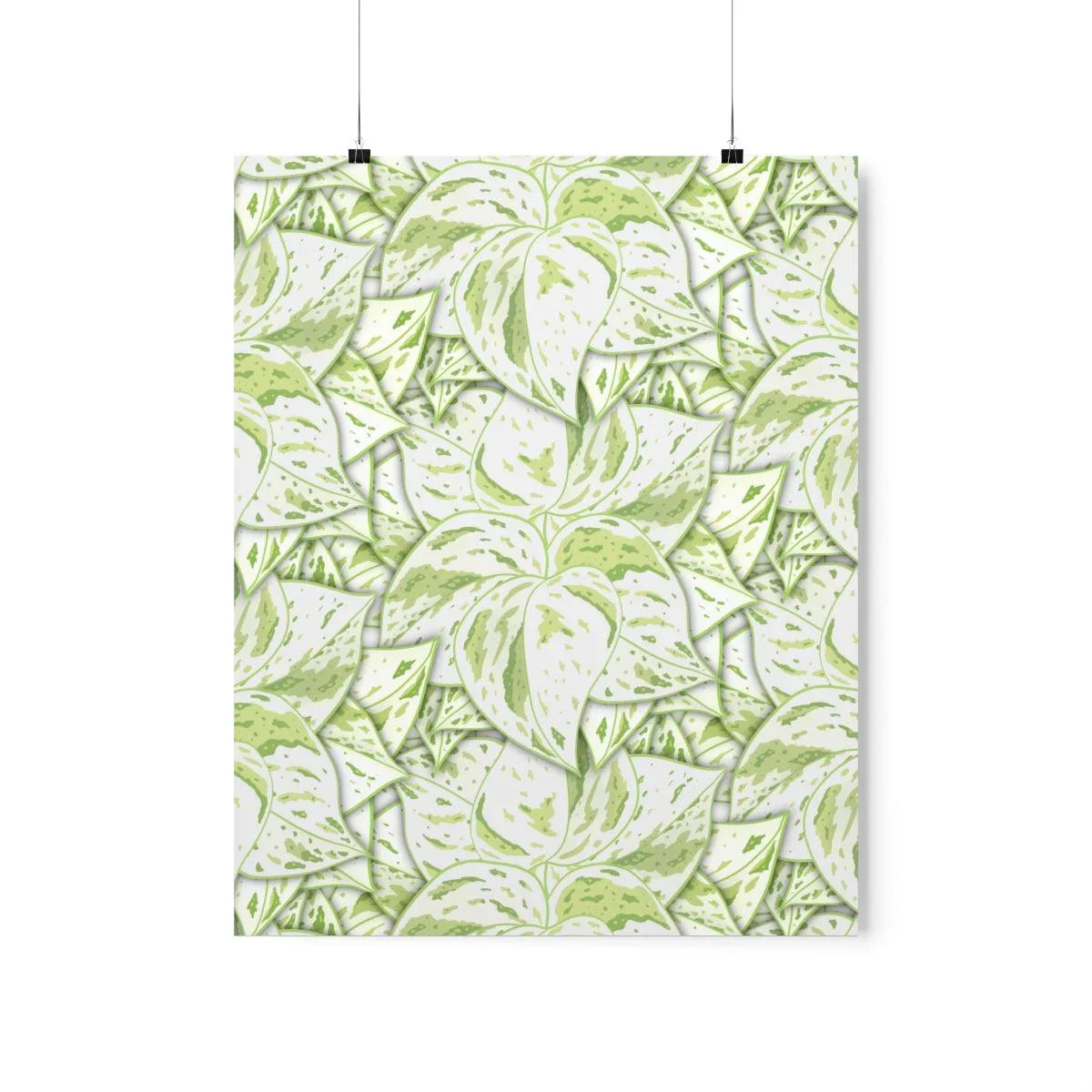 This variegated pothos print features a matte finish poster surface that reduces glare and enhances the intricate details of the white foliage artwork. Available in multiple sizes, the print's precise dimensions may vary slightly by +/- 1/16", reflecting careful production standards. The archival ink poster resists fading, preserving the crispness of every leaf and splash of color over time.