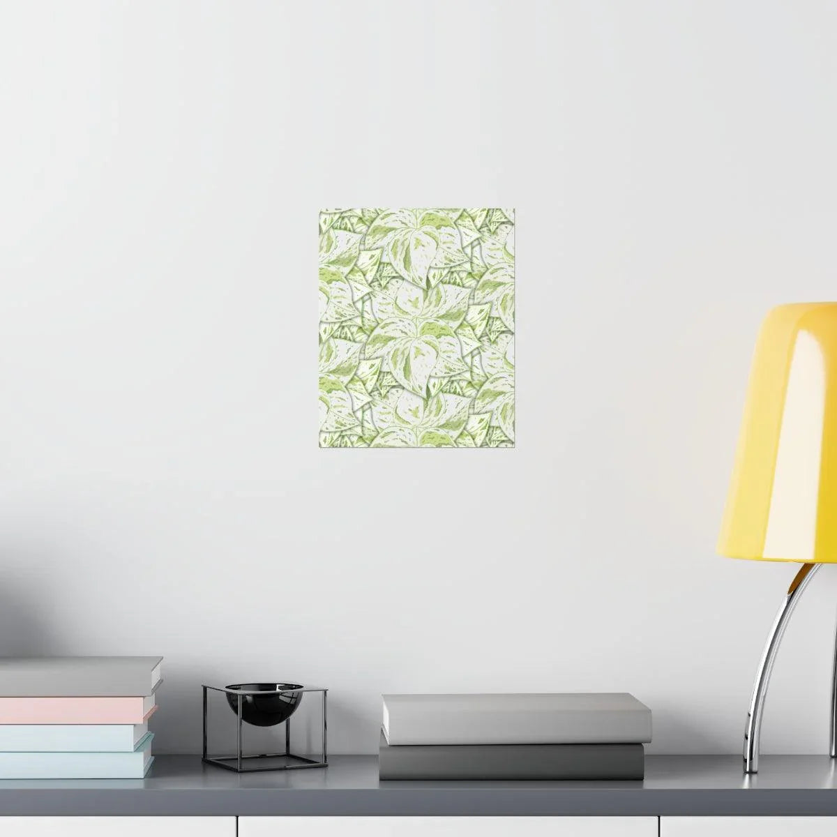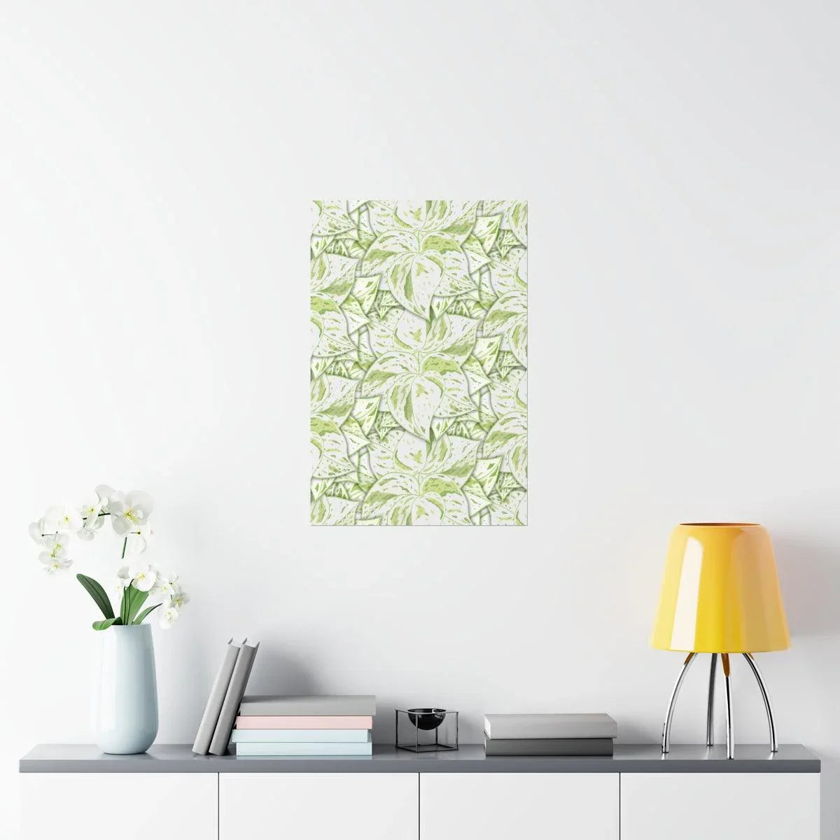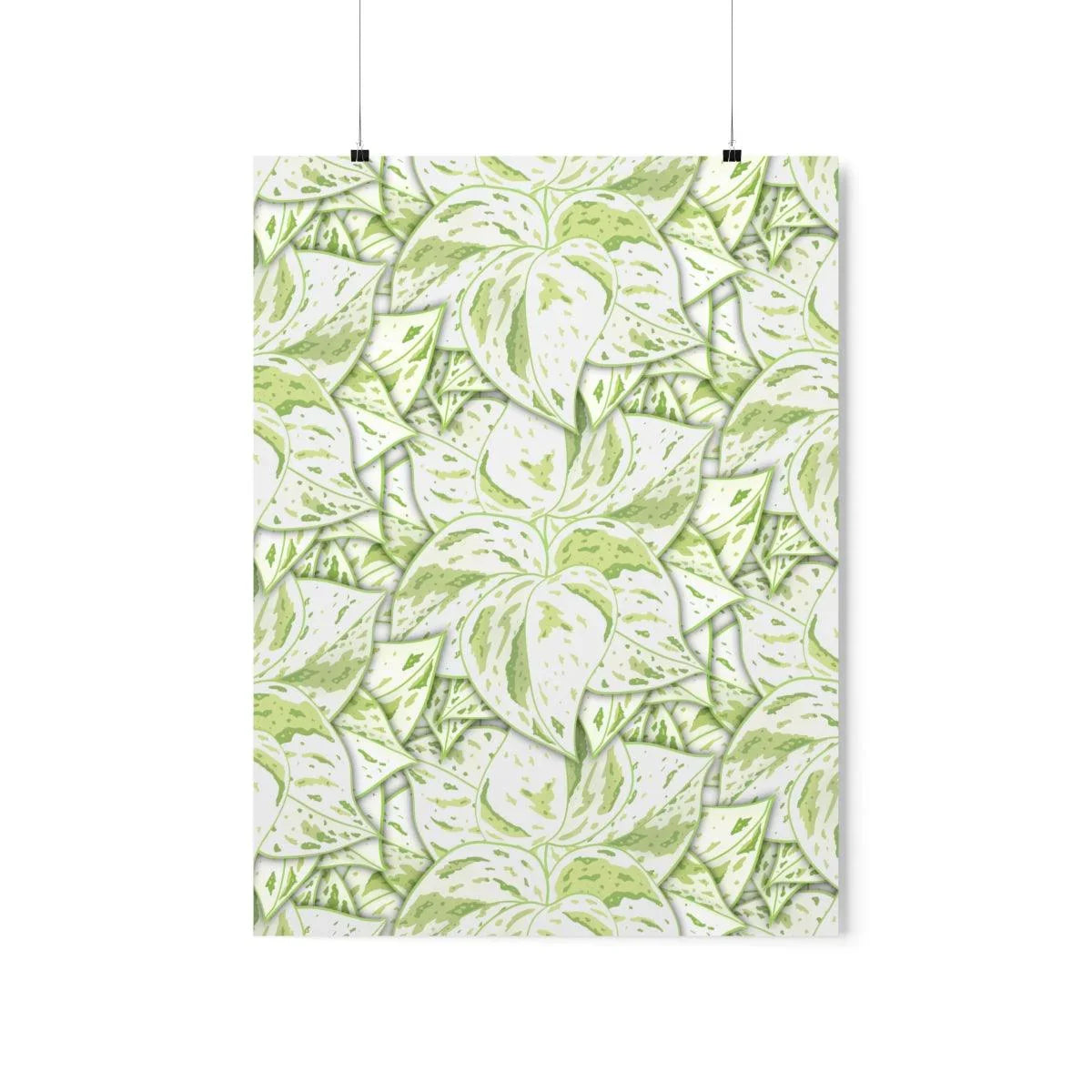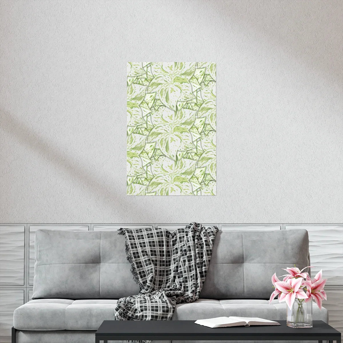 This variegated pothos print features a matte finish poster surface that reduces glare and enhances the intricate details of the white foliage artwork. Available in multiple sizes, the print's precise dimensions may vary slightly by +/- 1/16", reflecting careful production standards. The archival ink poster resists fading, preserving the crispness of every leaf and splash of color over time.