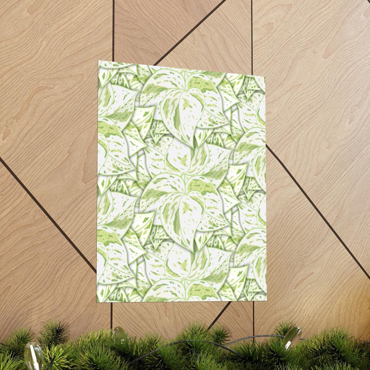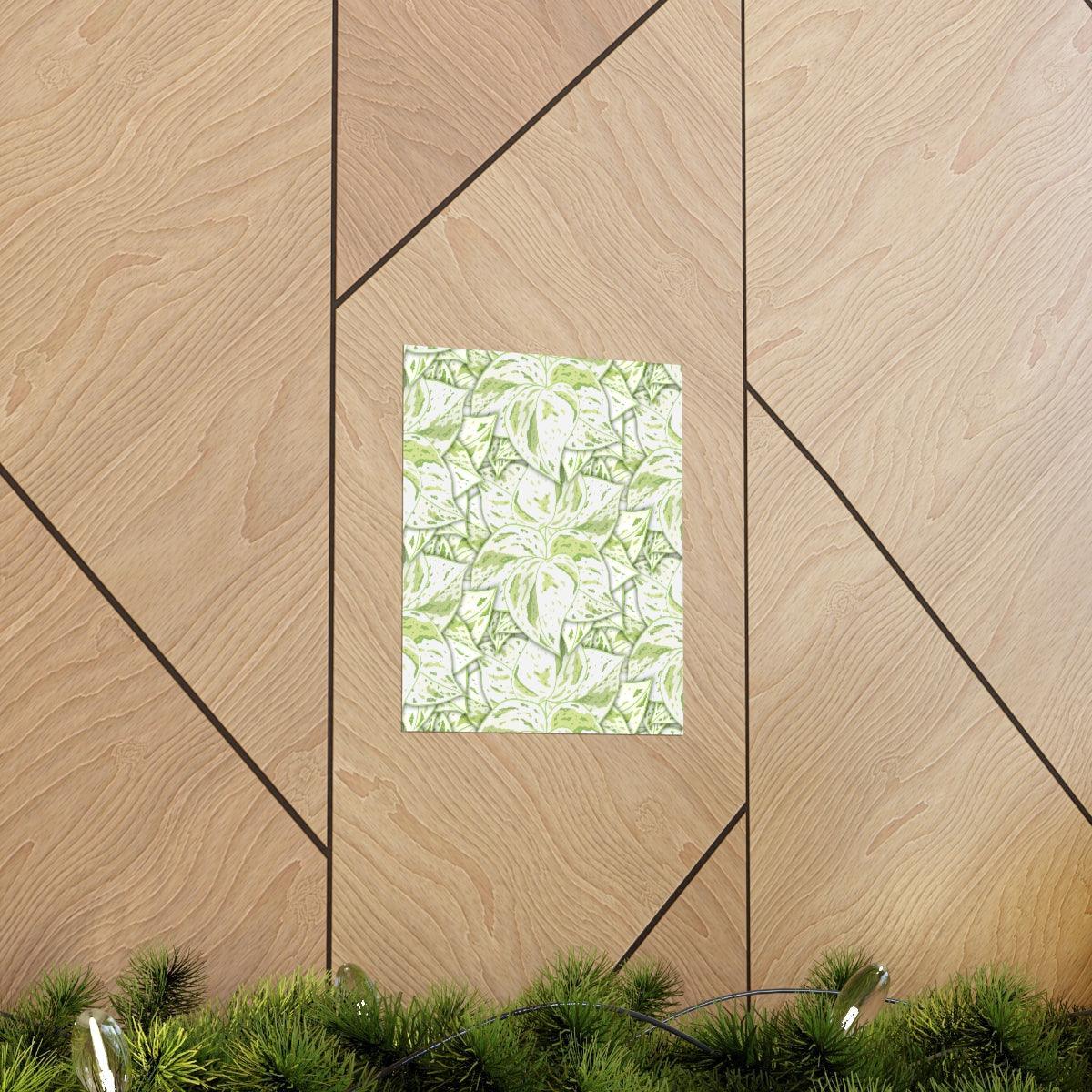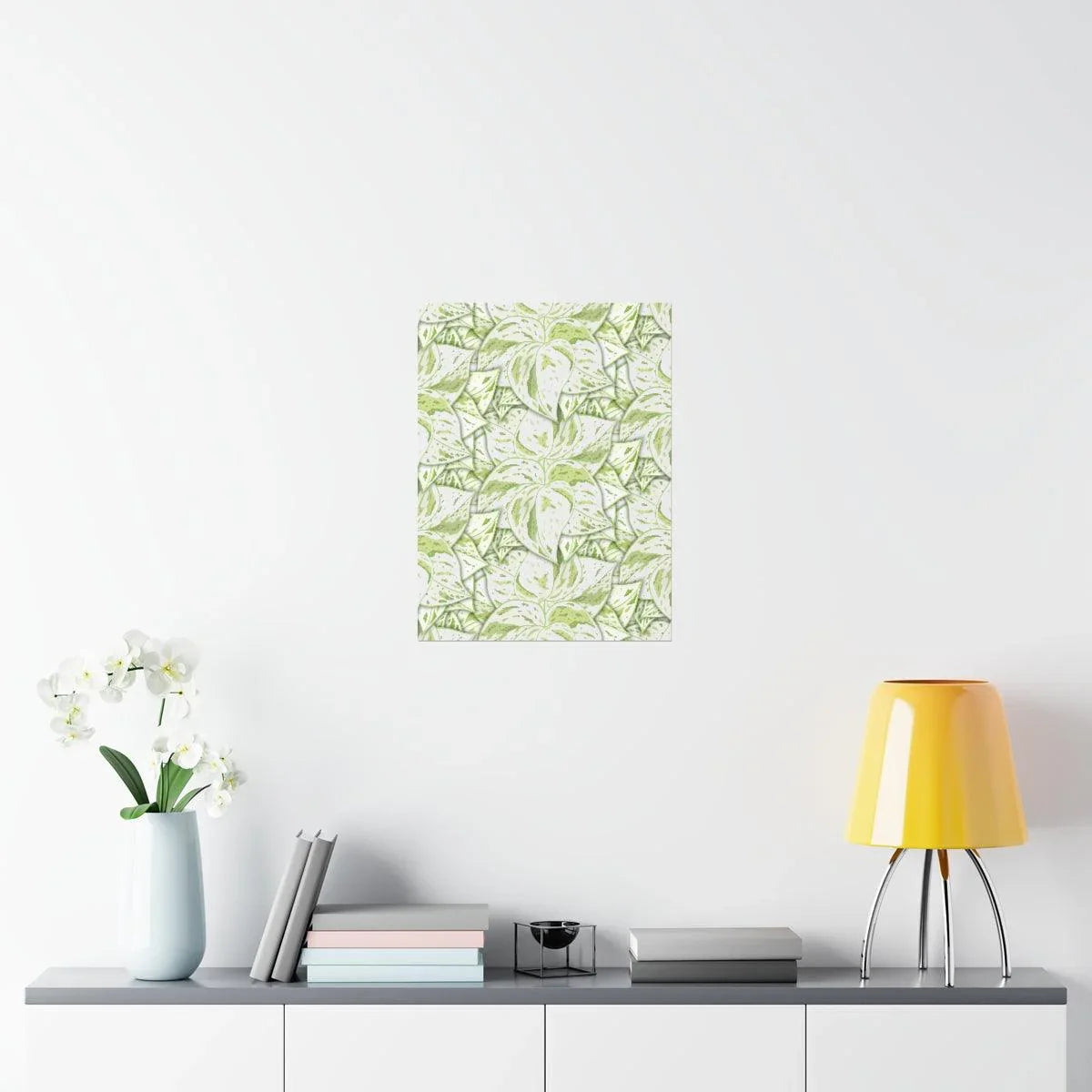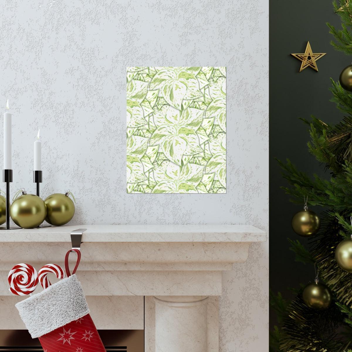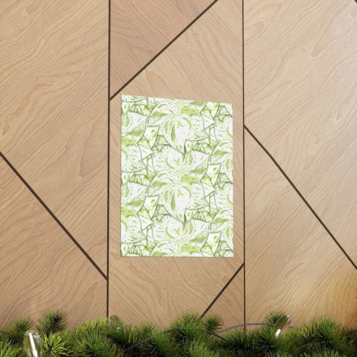 This variegated pothos print features a matte finish poster surface that reduces glare and enhances the intricate details of the white foliage artwork. Available in multiple sizes, the print's precise dimensions may vary slightly by +/- 1/16", reflecting careful production standards. The archival ink poster resists fading, preserving the crispness of every leaf and splash of color over time.