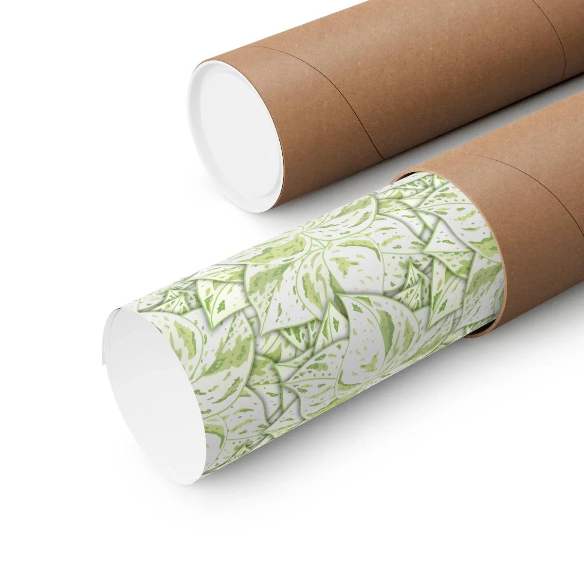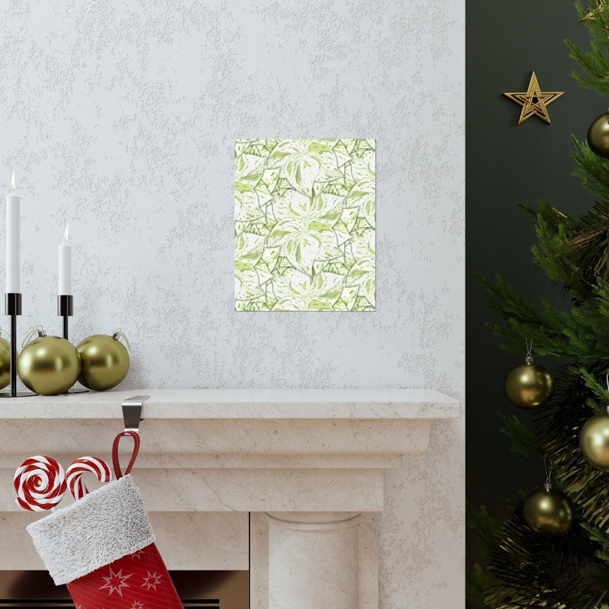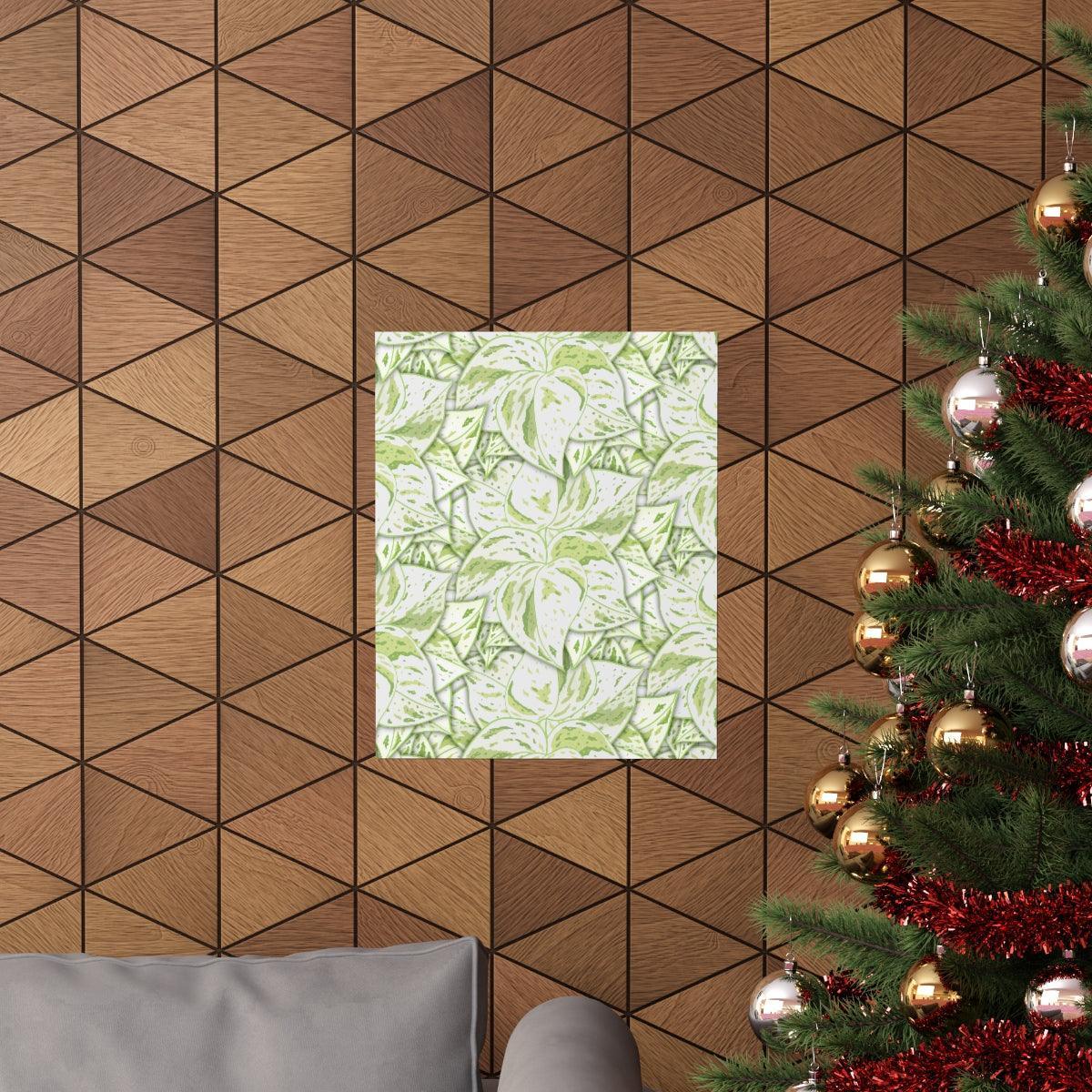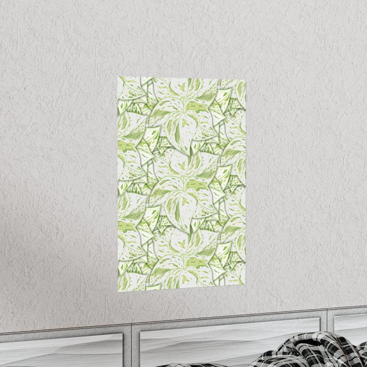 This variegated pothos print features a matte finish poster surface that reduces glare and enhances the intricate details of the white foliage artwork. Available in multiple sizes, the print's precise dimensions may vary slightly by +/- 1/16", reflecting careful production standards. The archival ink poster resists fading, preserving the crispness of every leaf and splash of color over time.