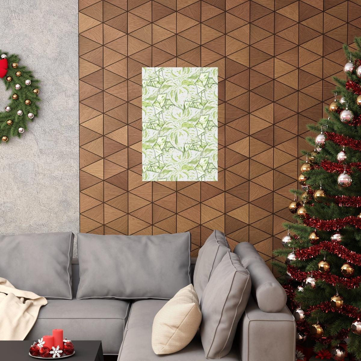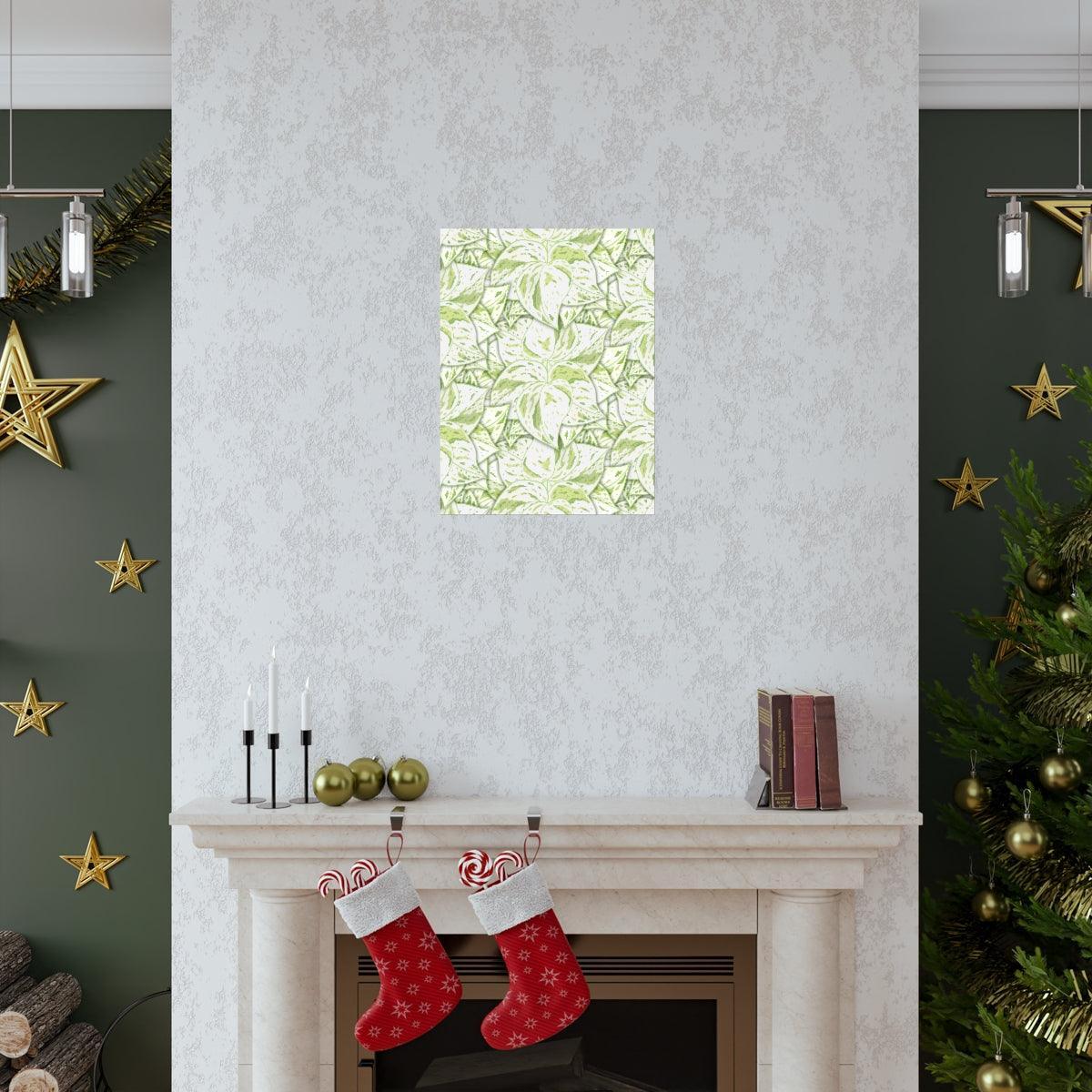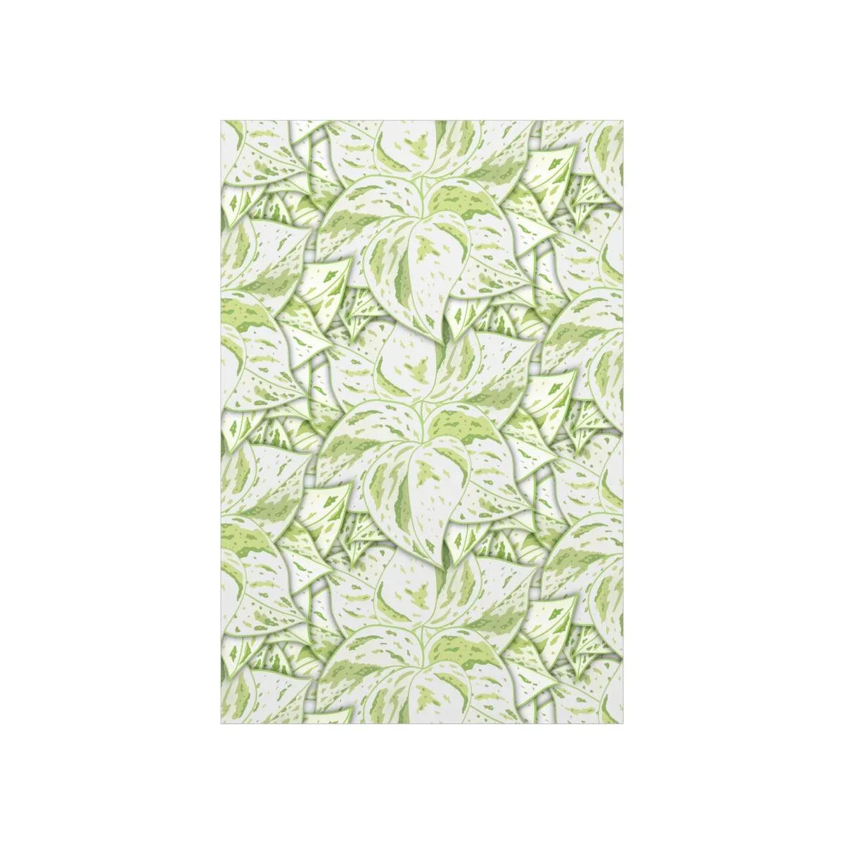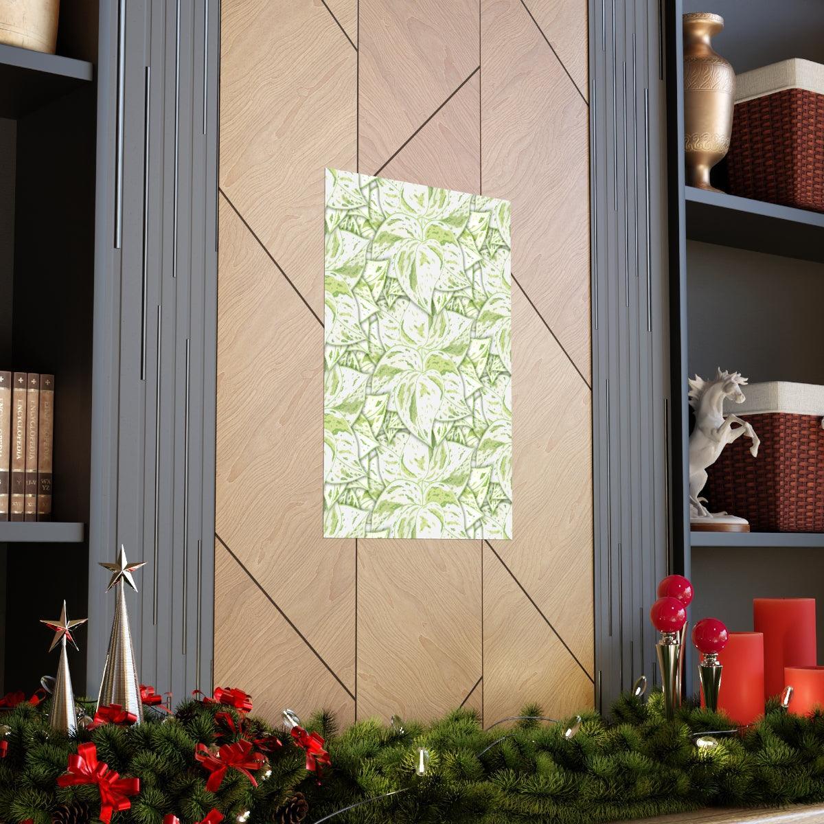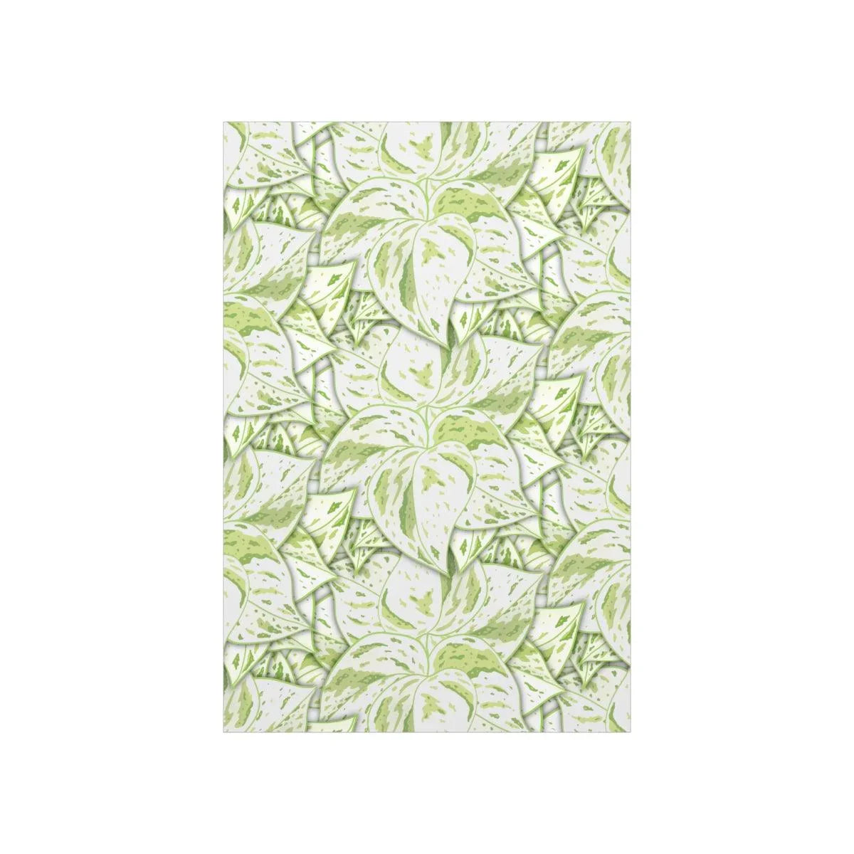 This variegated pothos print features a matte finish poster surface that reduces glare and enhances the intricate details of the white foliage artwork. Available in multiple sizes, the print's precise dimensions may vary slightly by +/- 1/16", reflecting careful production standards. The archival ink poster resists fading, preserving the crispness of every leaf and splash of color over time.