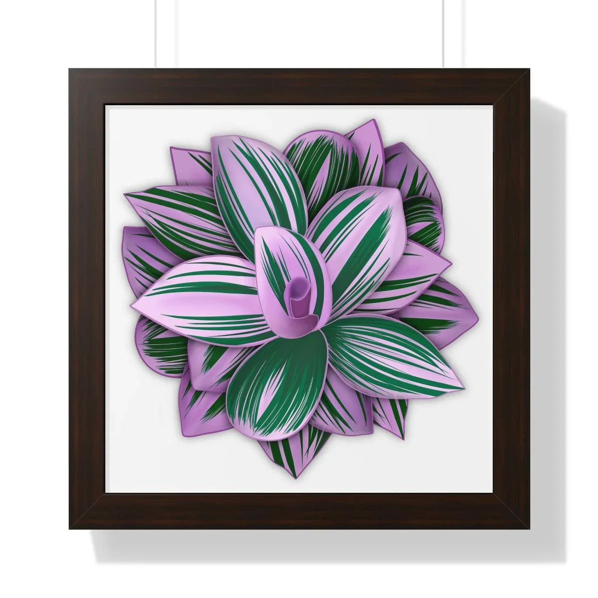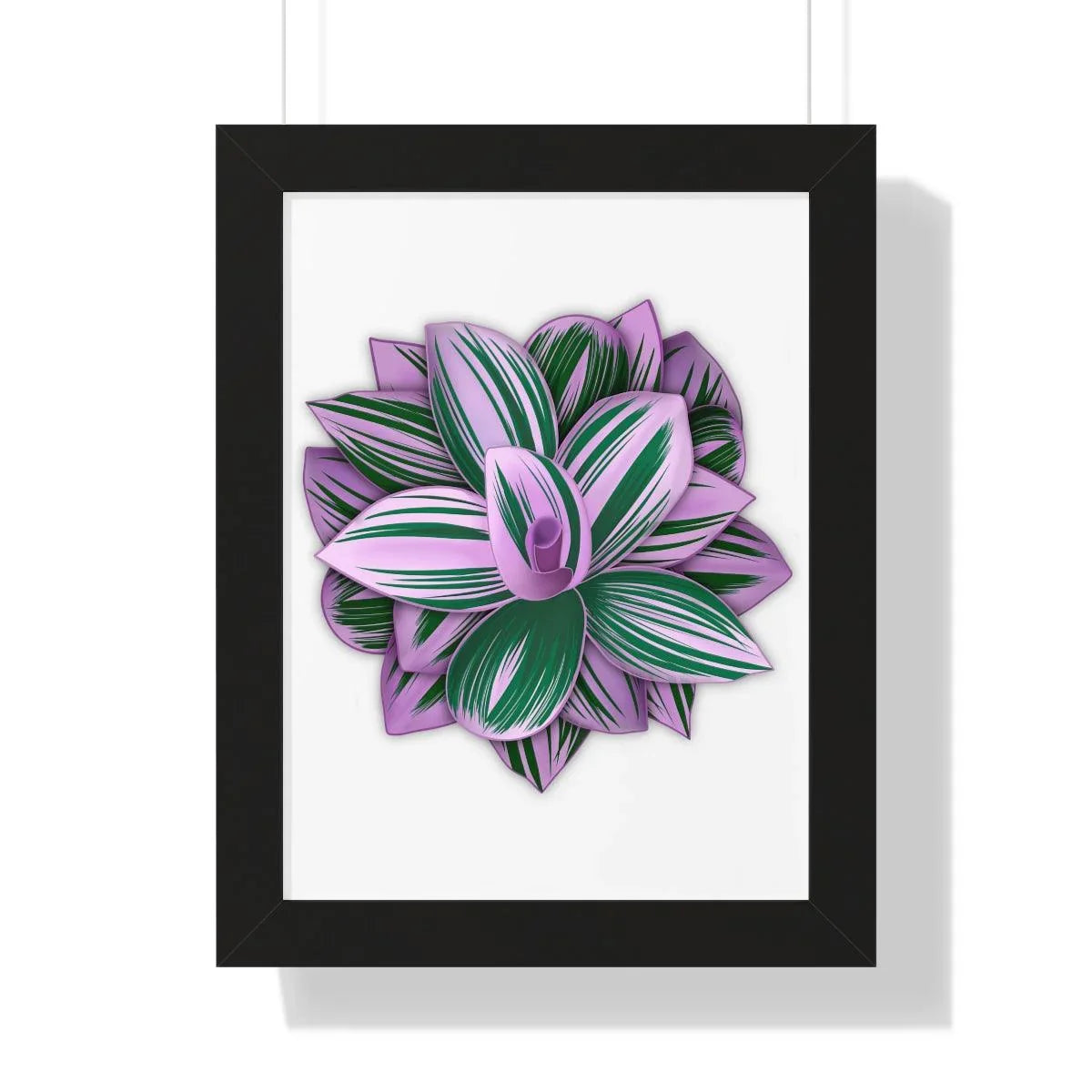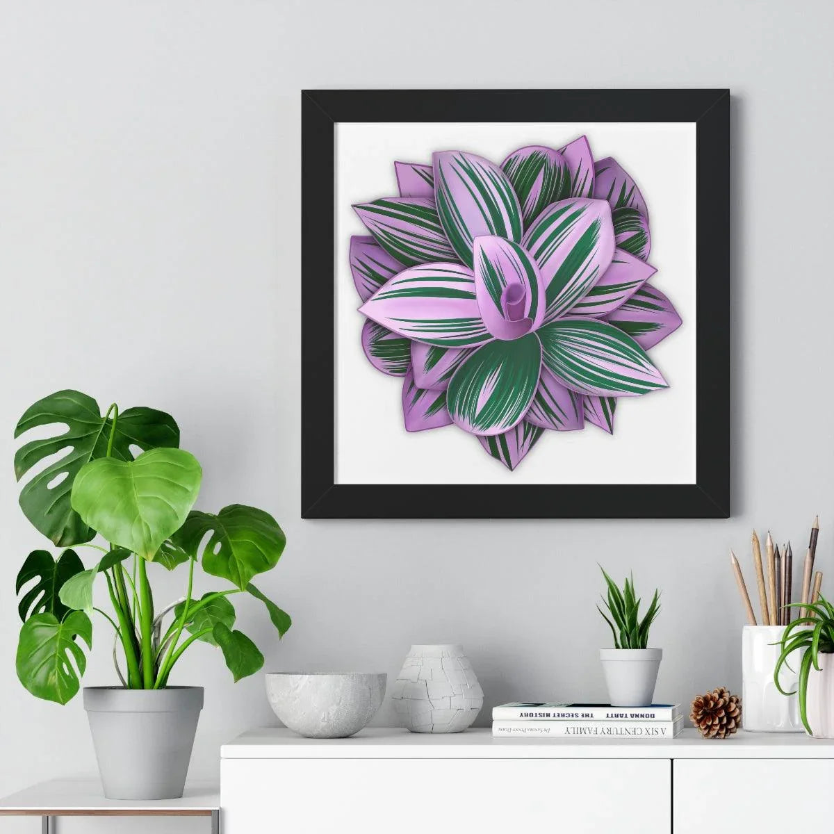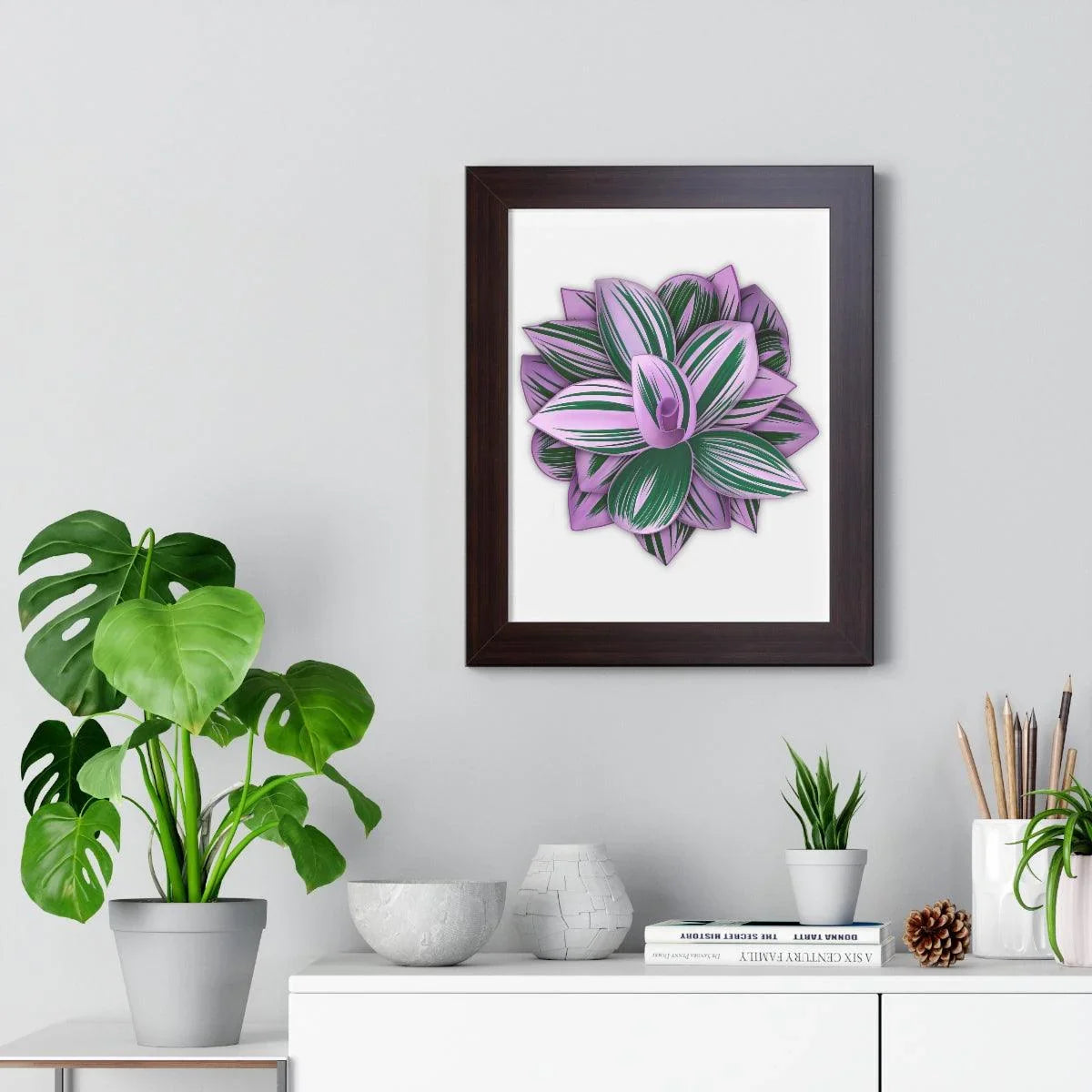The Tradescantia Nanouk print showcases a stunning framed botanical art piece that brings vibrant color and life to any home or office setting. This variegated leaf poster features the unique Tradescantia Nanouk plant, known for its mid-green leaves striped with cream and pink hues, and striking magenta-purple undersides, creating an eye-catching pink foliage wall art effect. Printed on premium matte paper, this indoor plant print combines vivid detail with a smooth finish to enhance your decorative nature print collection.