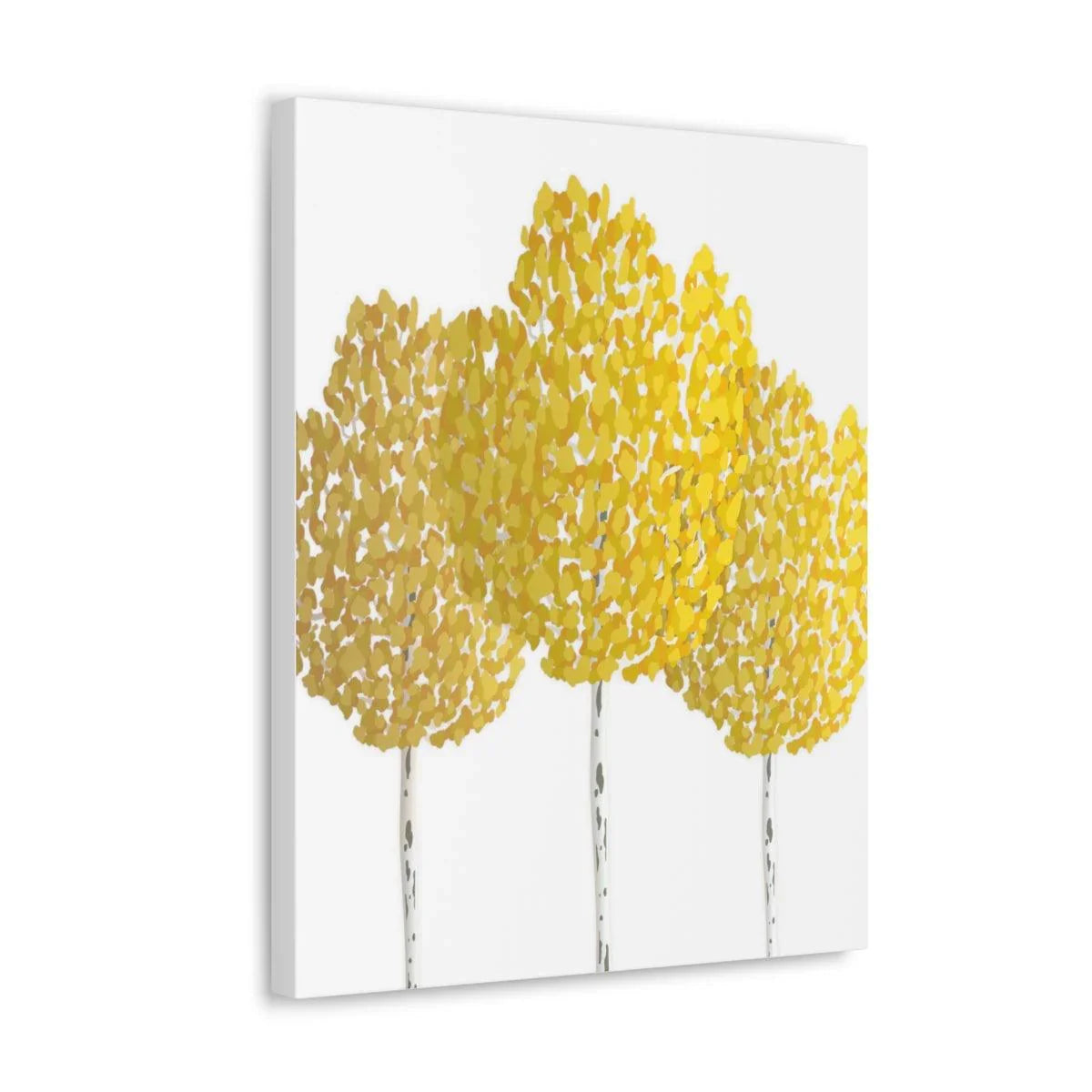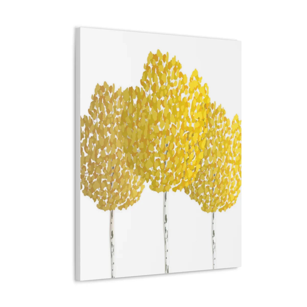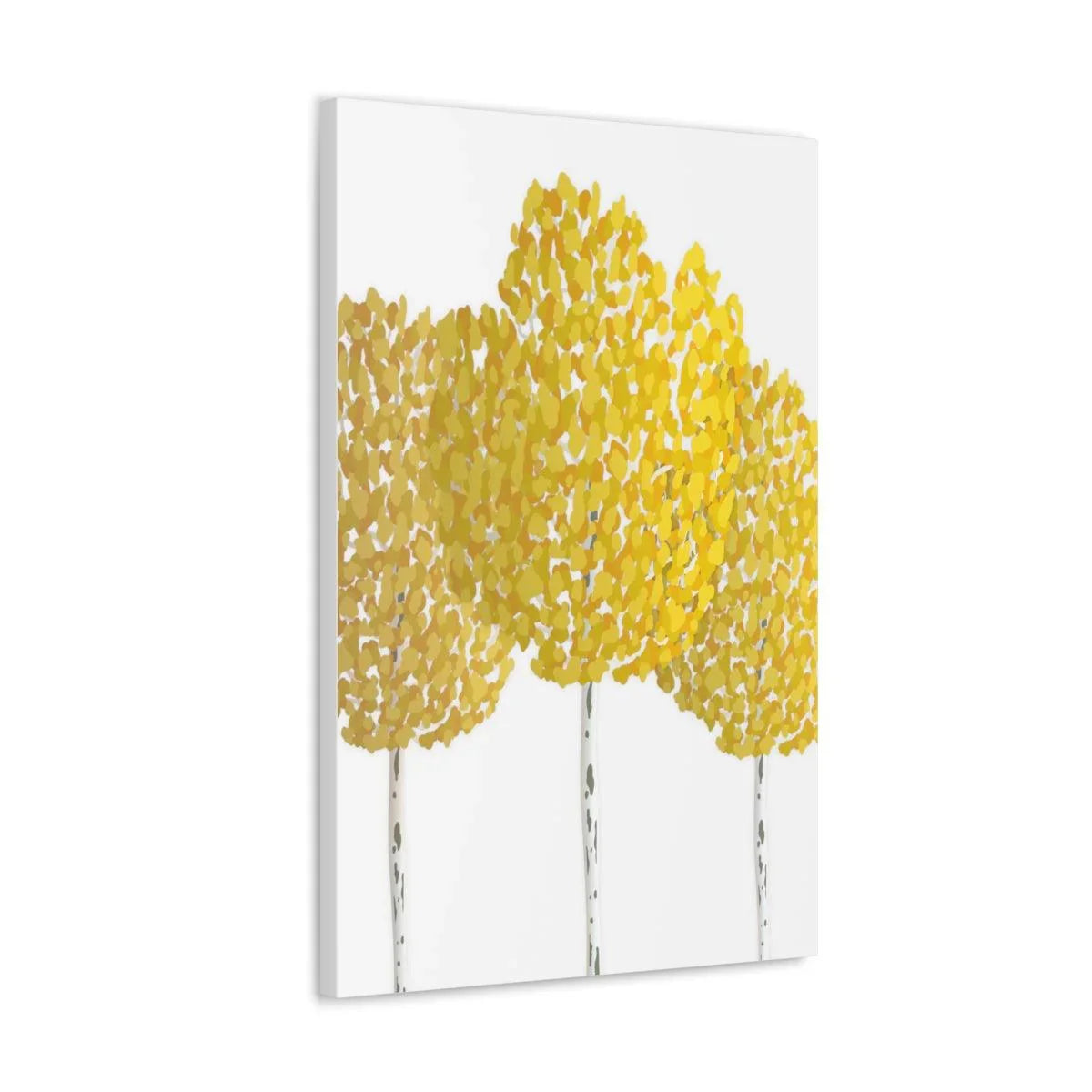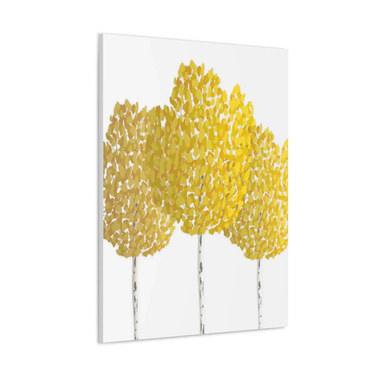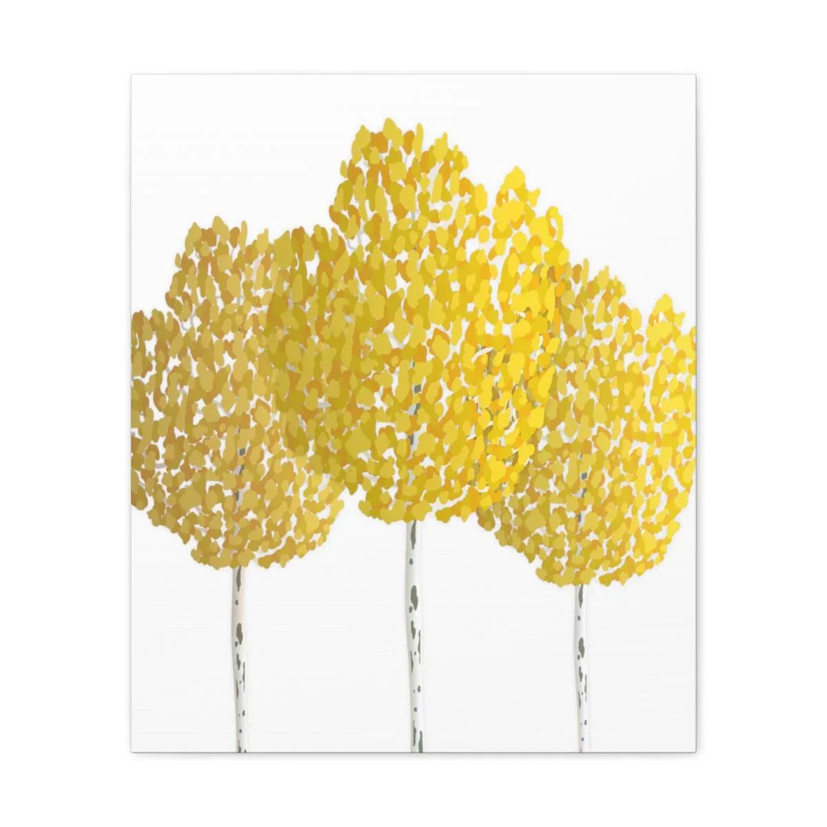 The Fall Aspen Canvas is a stunning stretched cotton canvas wall art featuring a vibrant yellow fall foliage print that captures the essence of quaking aspen trees. This indoor canvas decor brings nature wall decor into your home with vivid detail and artistic flair, created from hand-drawn designs by Laura Christine Photography. Measuring precisely to fit standard frames, this matte canvas painting offers a smooth surface that enhances the rich colors of the Populus tremuloides poster, making it an ideal piece for artistic home decor enthusiasts.
