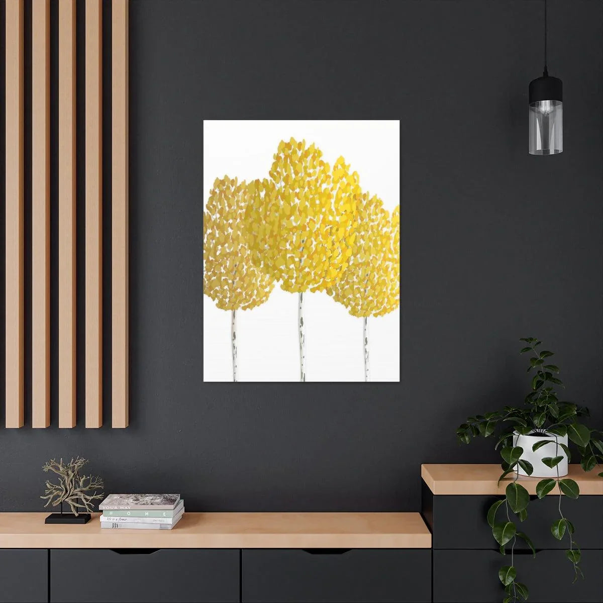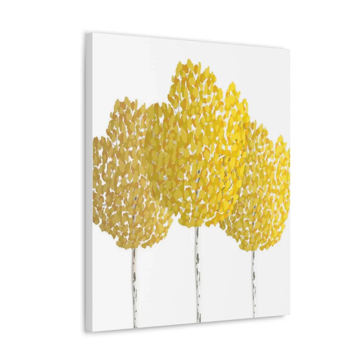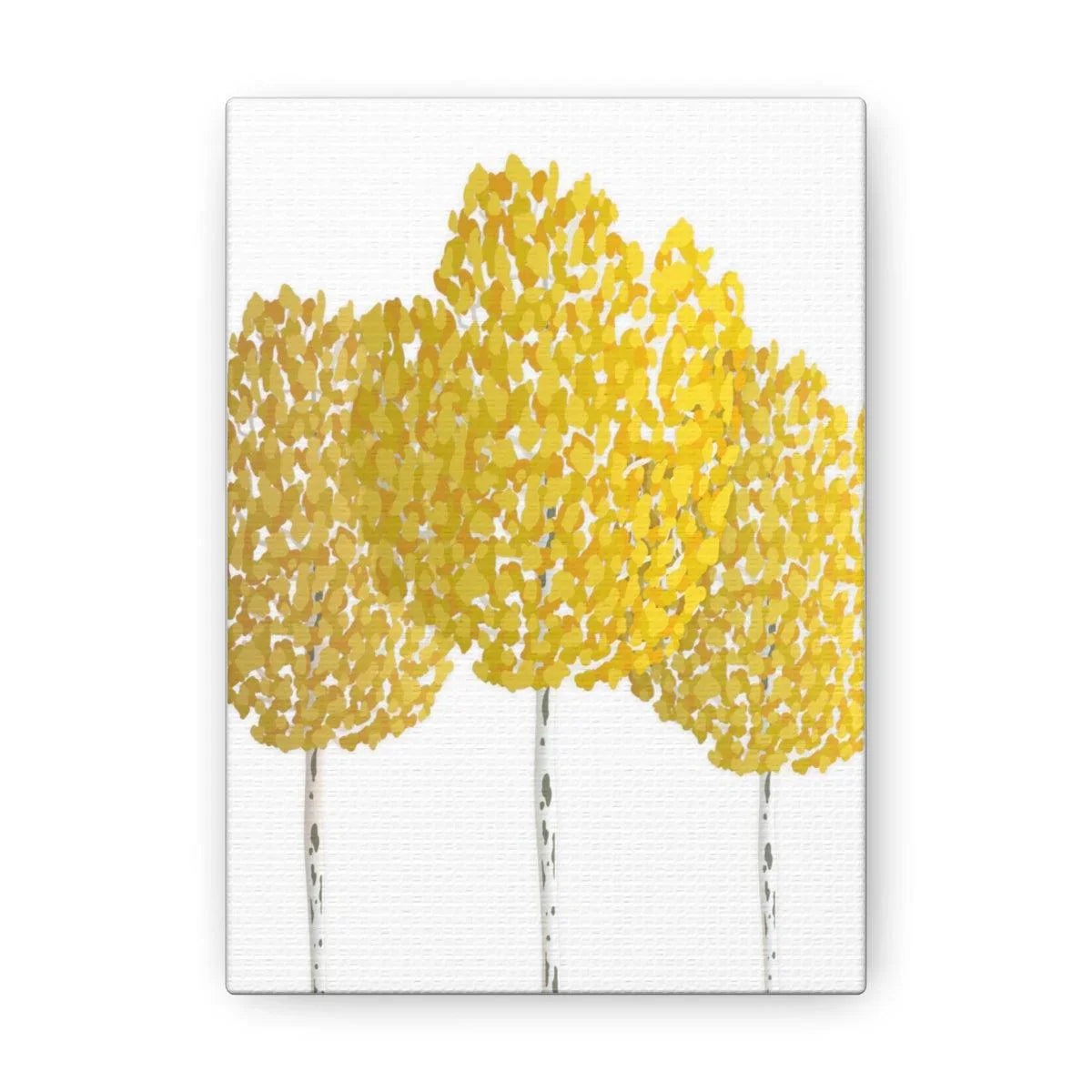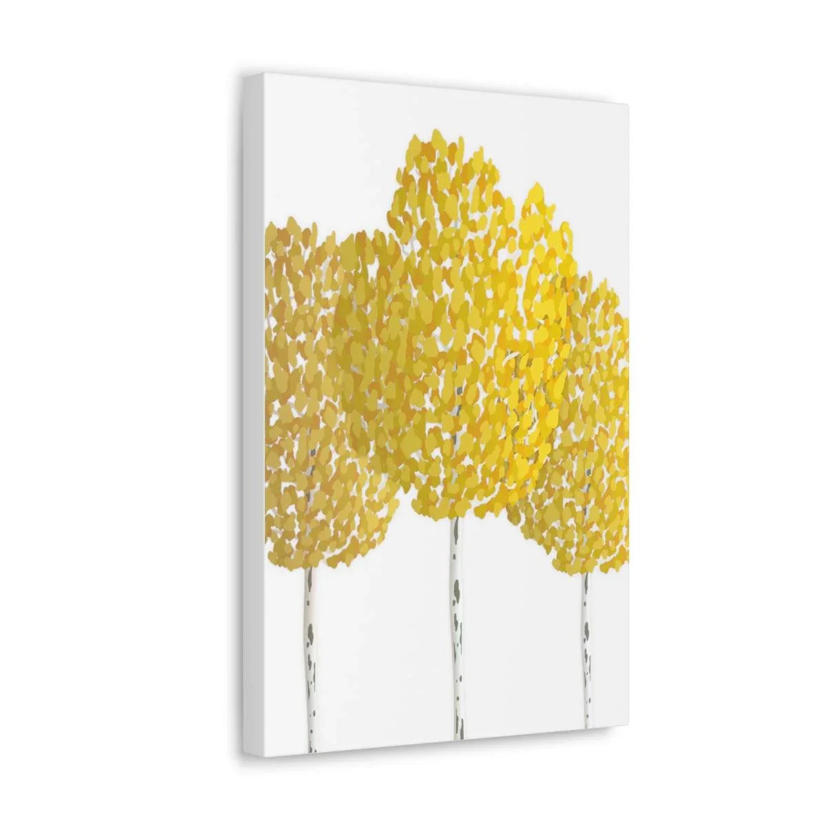 The Fall Aspen Canvas is a stunning stretched cotton canvas wall art featuring a vibrant yellow fall foliage print that captures the essence of quaking aspen trees. This indoor canvas decor brings nature wall decor into your home with vivid detail and artistic flair, created from hand-drawn designs by Laura Christine Photography. Measuring precisely to fit standard frames, this matte canvas painting offers a smooth surface that enhances the rich colors of the Populus tremuloides poster, making it an ideal piece for artistic home decor enthusiasts.