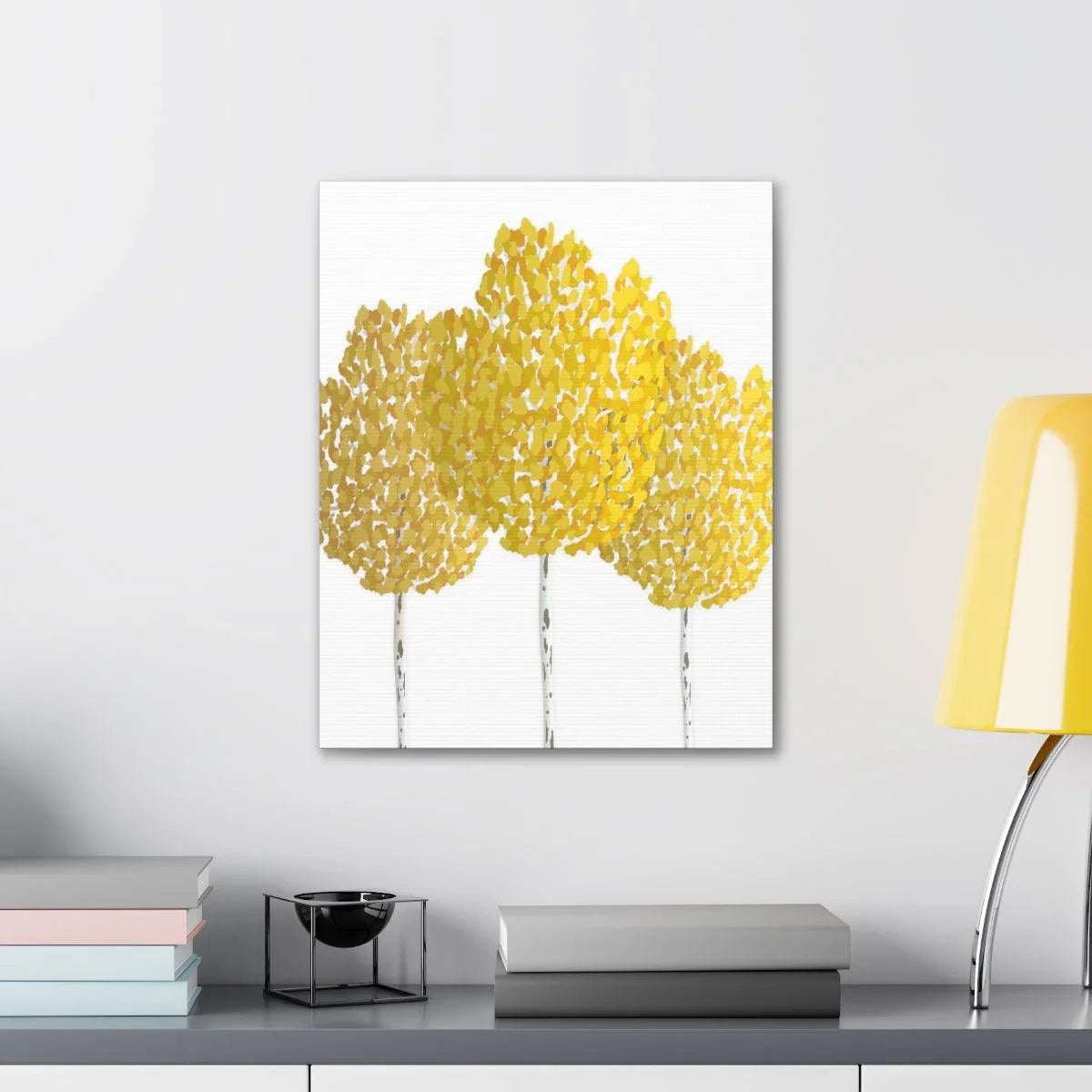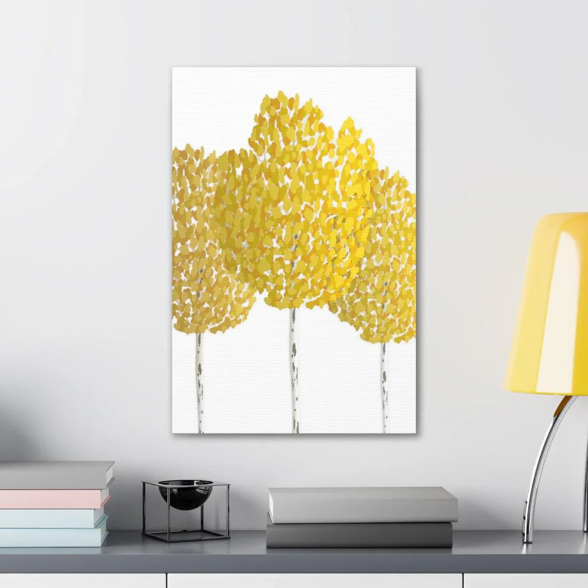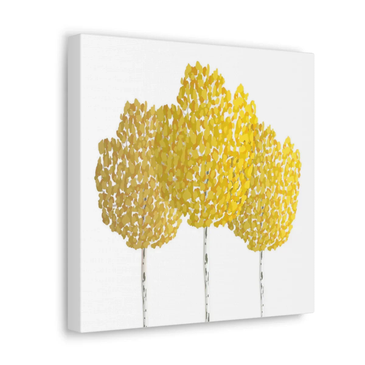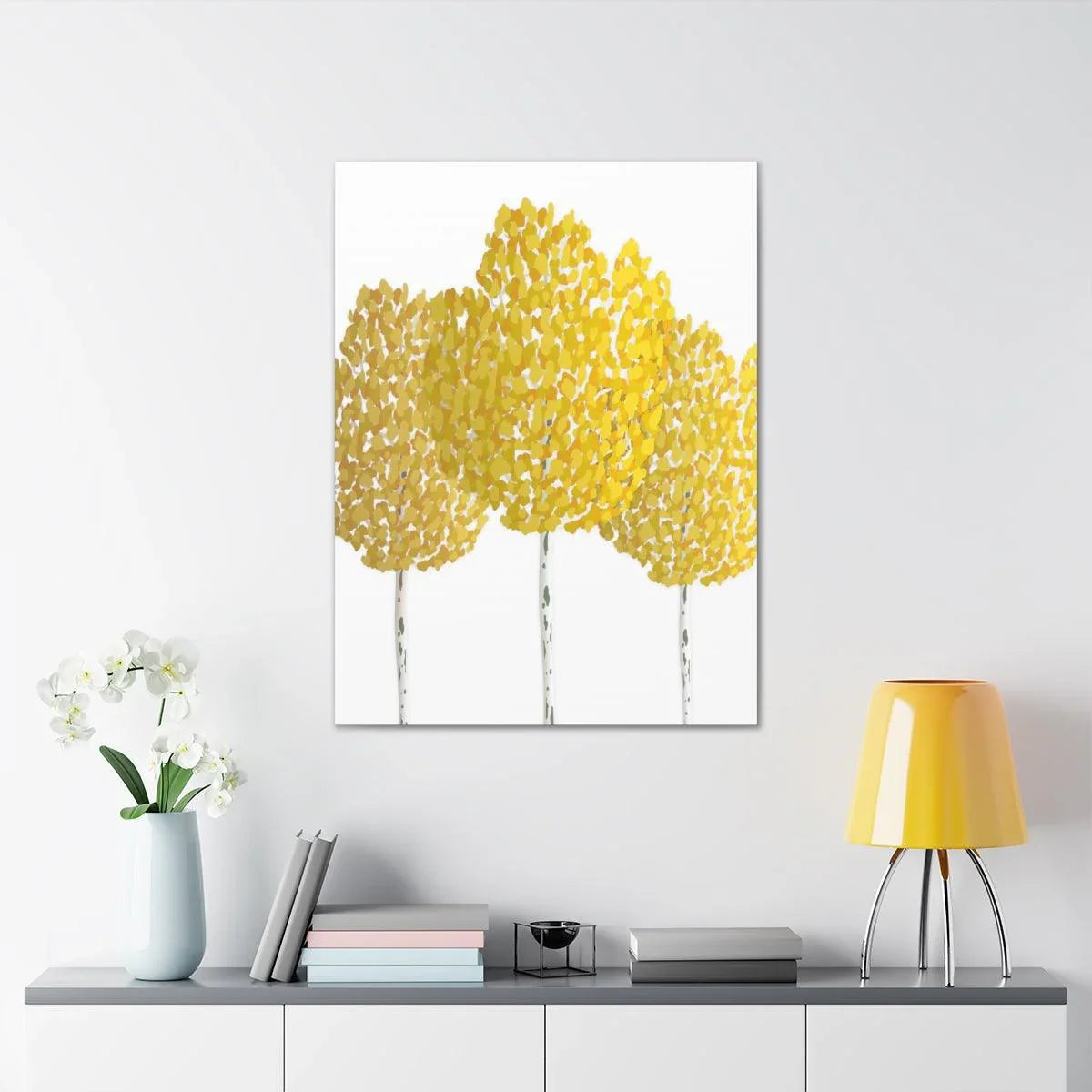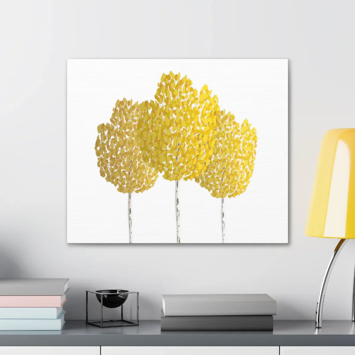 The Fall Aspen Canvas is a stunning stretched cotton canvas wall art featuring a vibrant yellow fall foliage print that captures the essence of quaking aspen trees. This indoor canvas decor brings nature wall decor into your home with vivid detail and artistic flair, created from hand-drawn designs by Laura Christine Photography. Measuring precisely to fit standard frames, this matte canvas painting offers a smooth surface that enhances the rich colors of the Populus tremuloides poster, making it an ideal piece for artistic home decor enthusiasts.