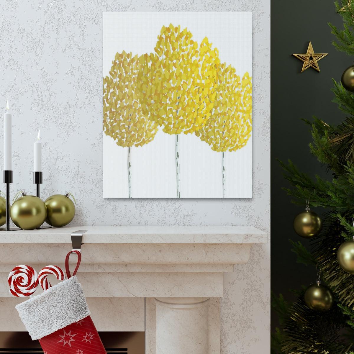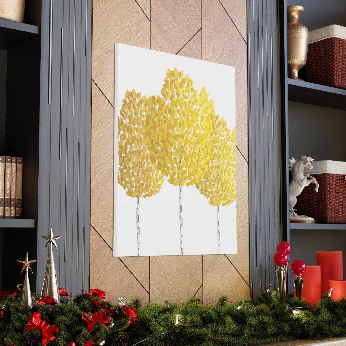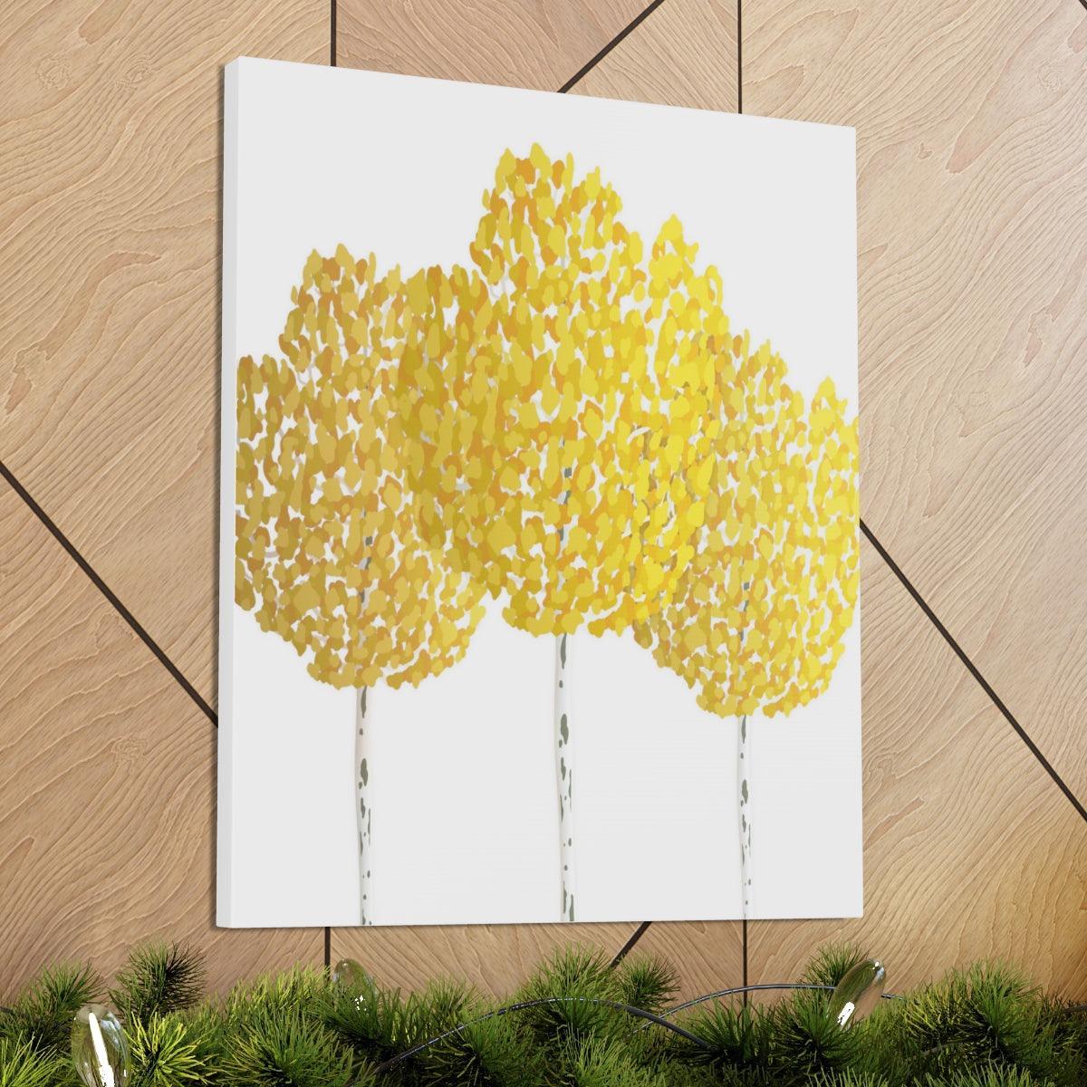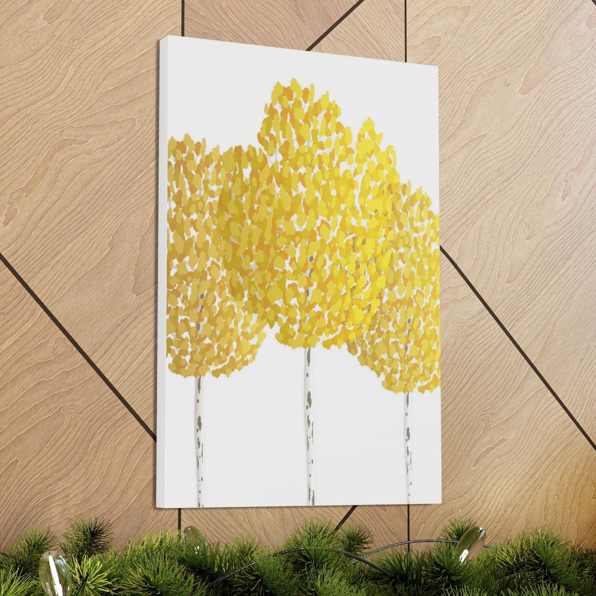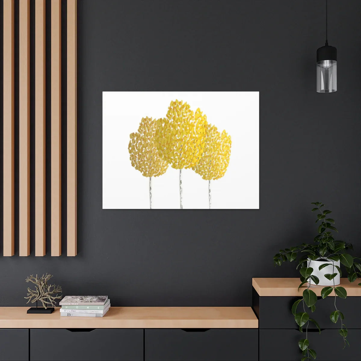 The Fall Aspen Canvas is a stunning stretched cotton canvas wall art featuring a vibrant yellow fall foliage print that captures the essence of quaking aspen trees. This indoor canvas decor brings nature wall decor into your home with vivid detail and artistic flair, created from hand-drawn designs by Laura Christine Photography. Measuring precisely to fit standard frames, this matte canvas painting offers a smooth surface that enhances the rich colors of the Populus tremuloides poster, making it an ideal piece for artistic home decor enthusiasts.