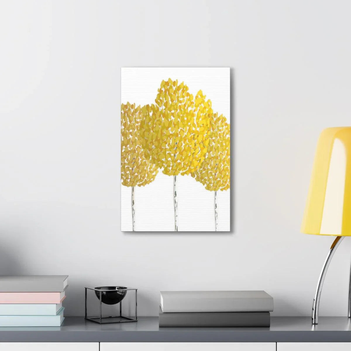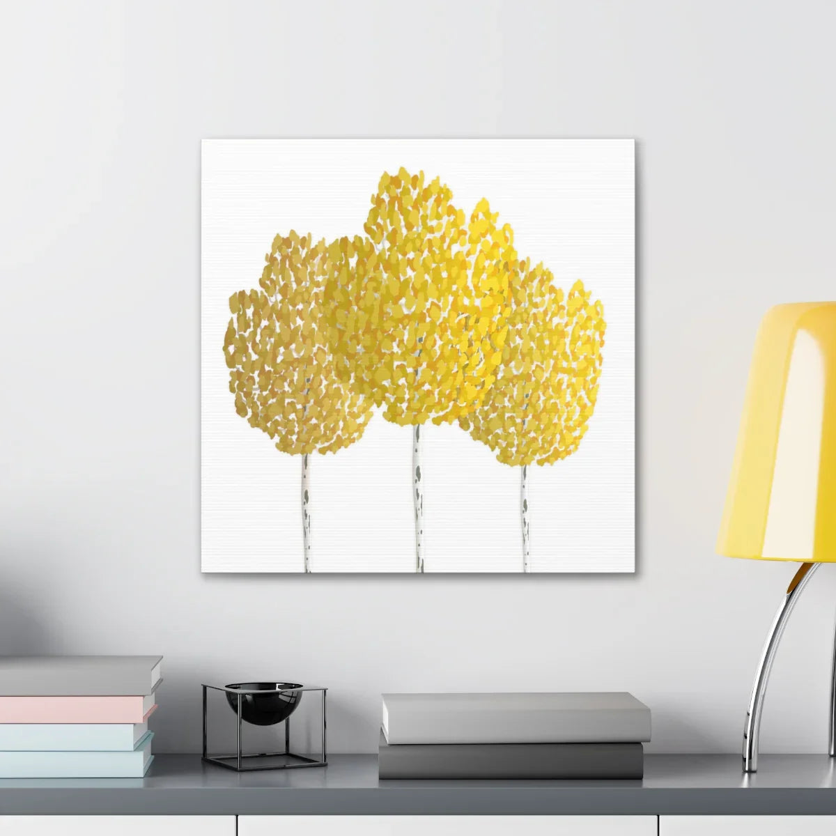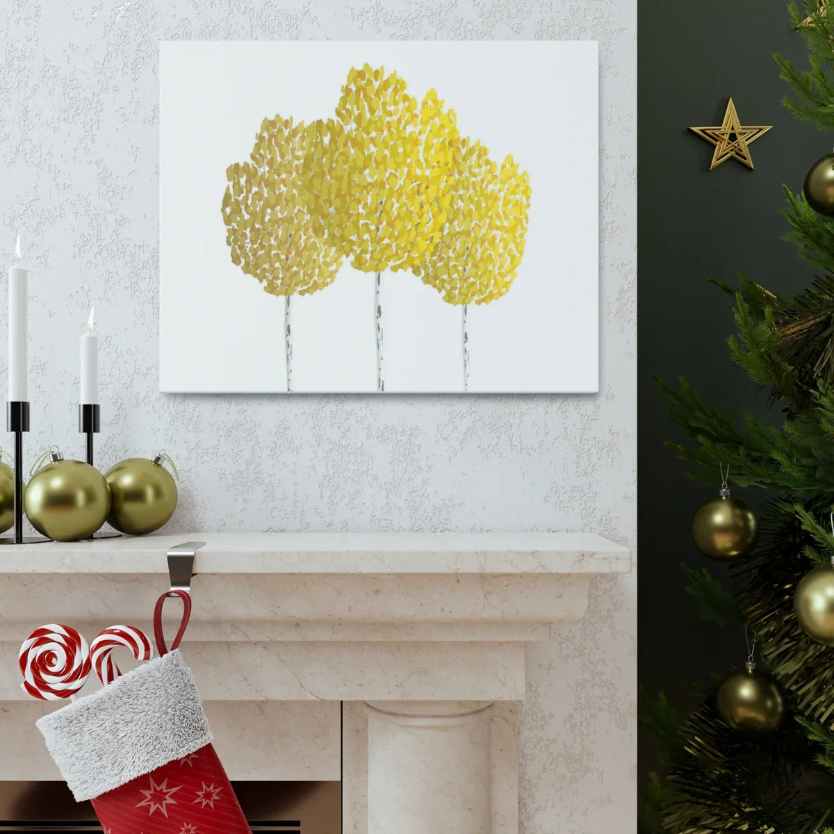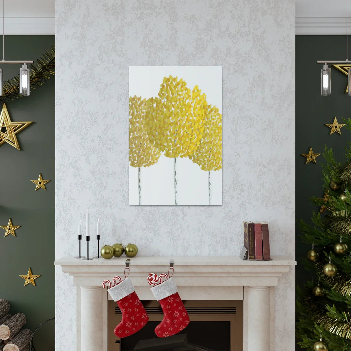 The Fall Aspen Canvas is a stunning stretched cotton canvas wall art featuring a vibrant yellow fall foliage print that captures the essence of quaking aspen trees. This indoor canvas decor brings nature wall decor into your home with vivid detail and artistic flair, created from hand-drawn designs by Laura Christine Photography. Measuring precisely to fit standard frames, this matte canvas painting offers a smooth surface that enhances the rich colors of the Populus tremuloides poster, making it an ideal piece for artistic home decor enthusiasts.