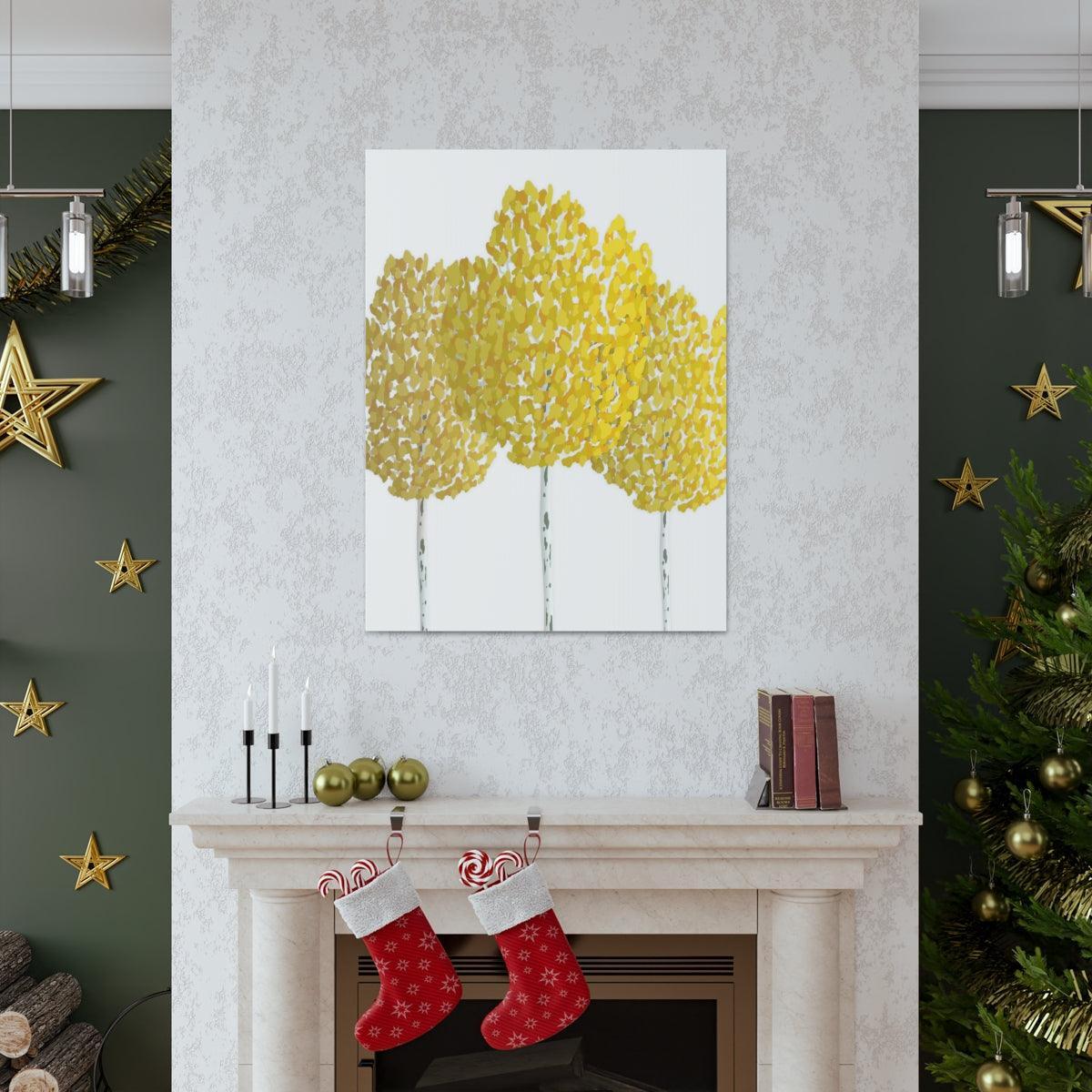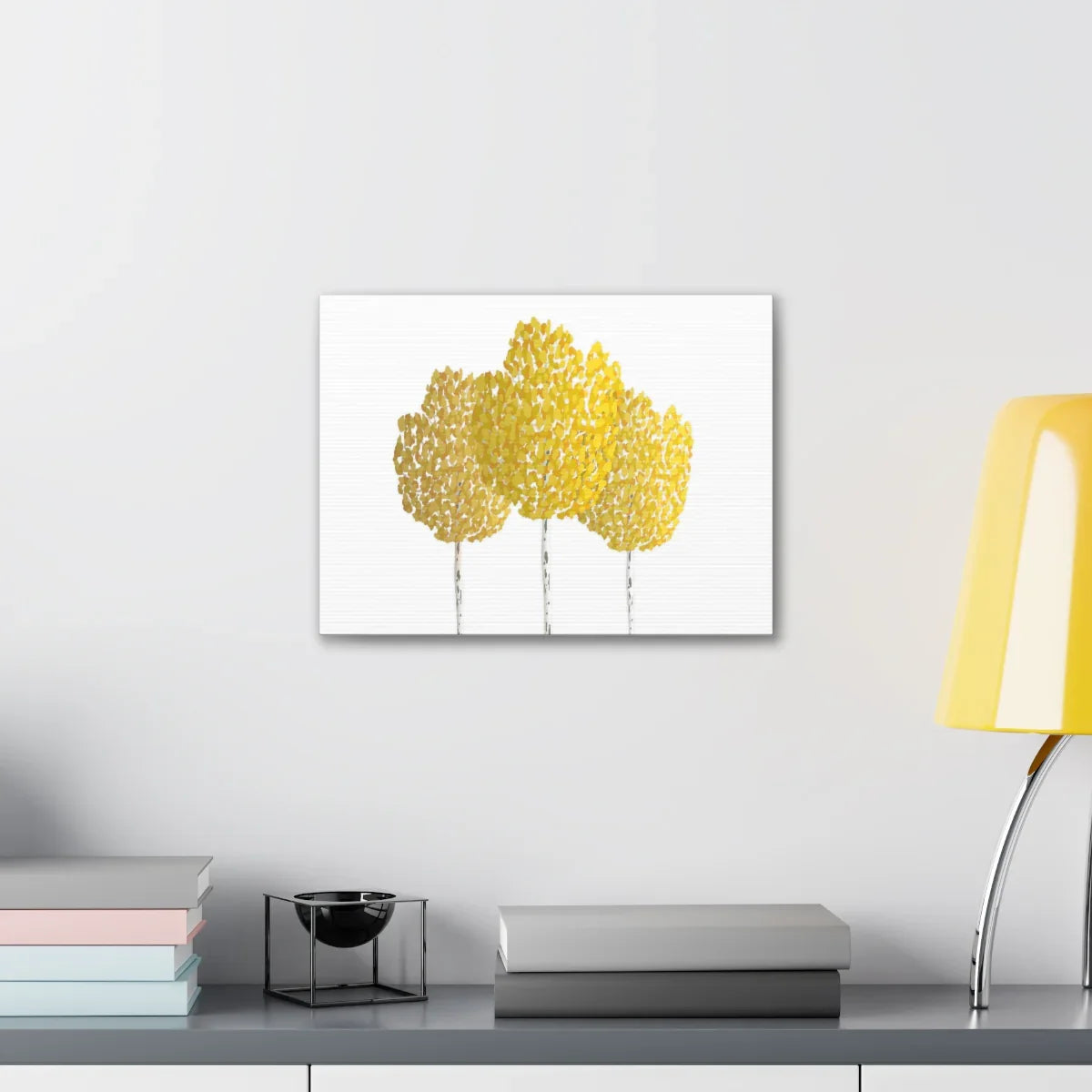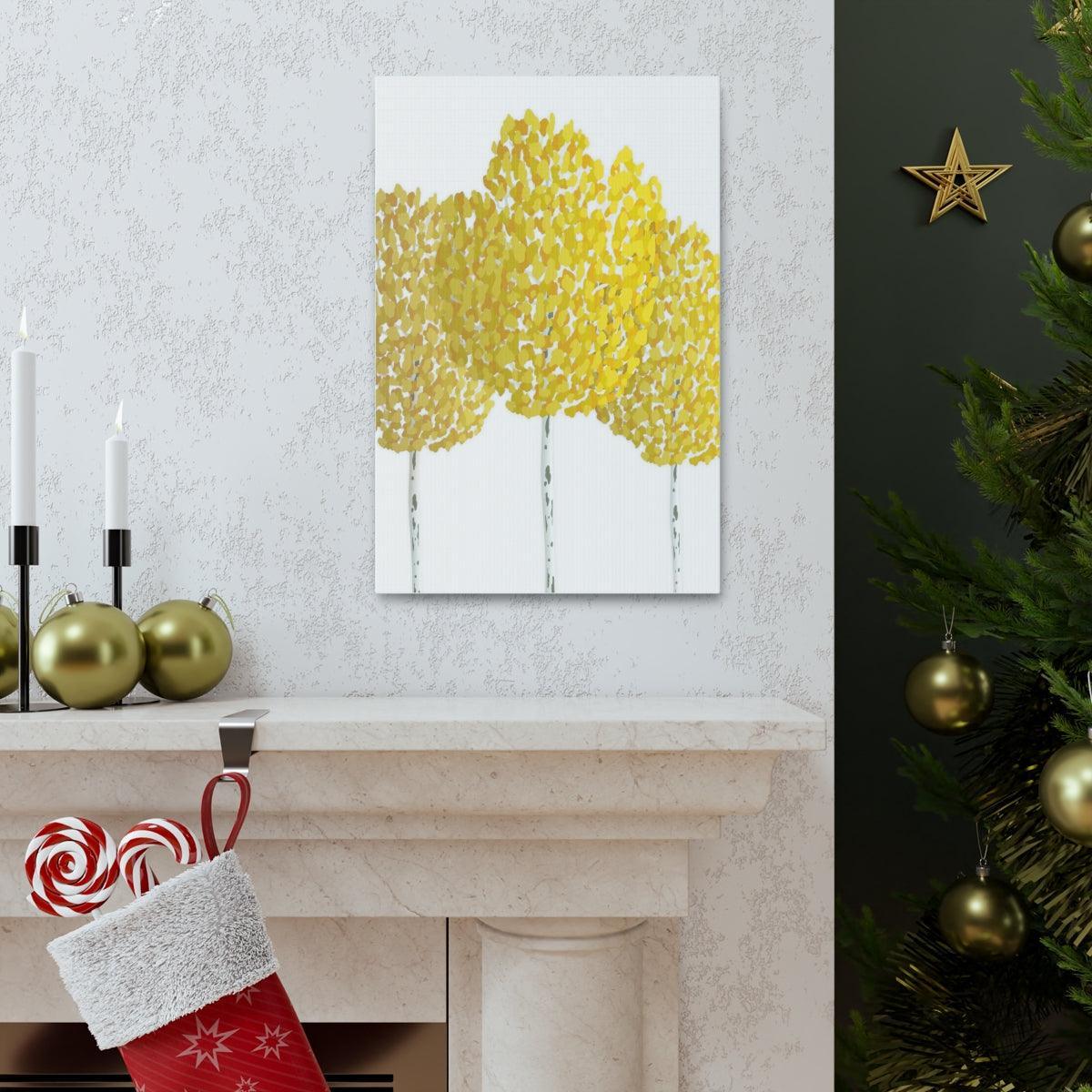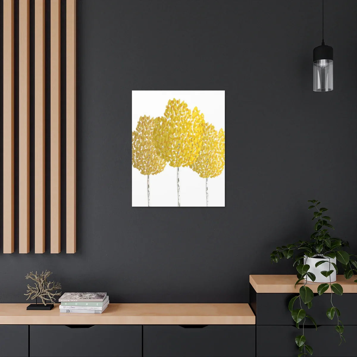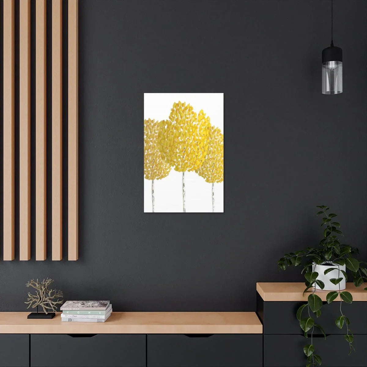 The Fall Aspen Canvas is a stunning stretched cotton canvas wall art featuring a vibrant yellow fall foliage print that captures the essence of quaking aspen trees. This indoor canvas decor brings nature wall decor into your home with vivid detail and artistic flair, created from hand-drawn designs by Laura Christine Photography. Measuring precisely to fit standard frames, this matte canvas painting offers a smooth surface that enhances the rich colors of the Populus tremuloides poster, making it an ideal piece for artistic home decor enthusiasts.