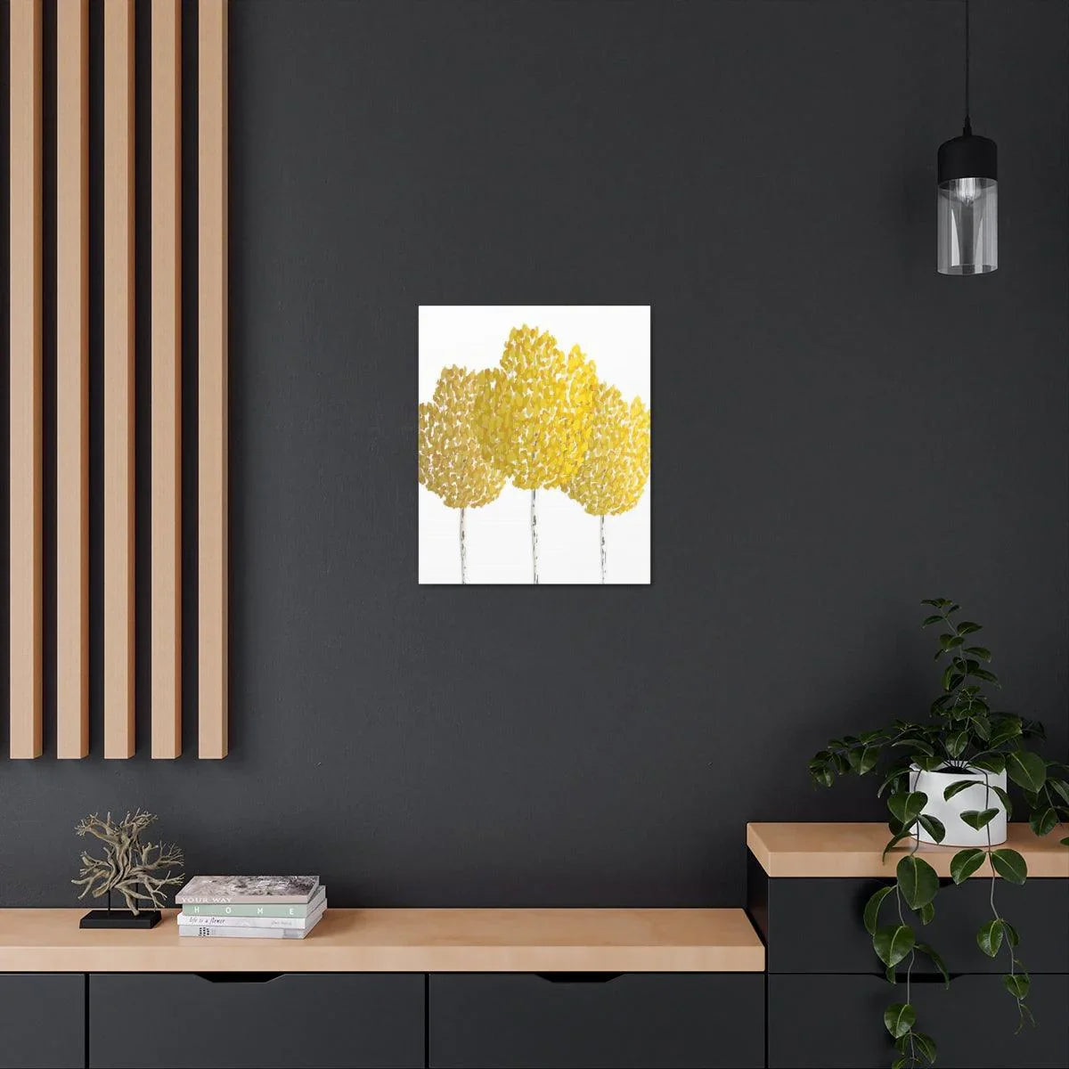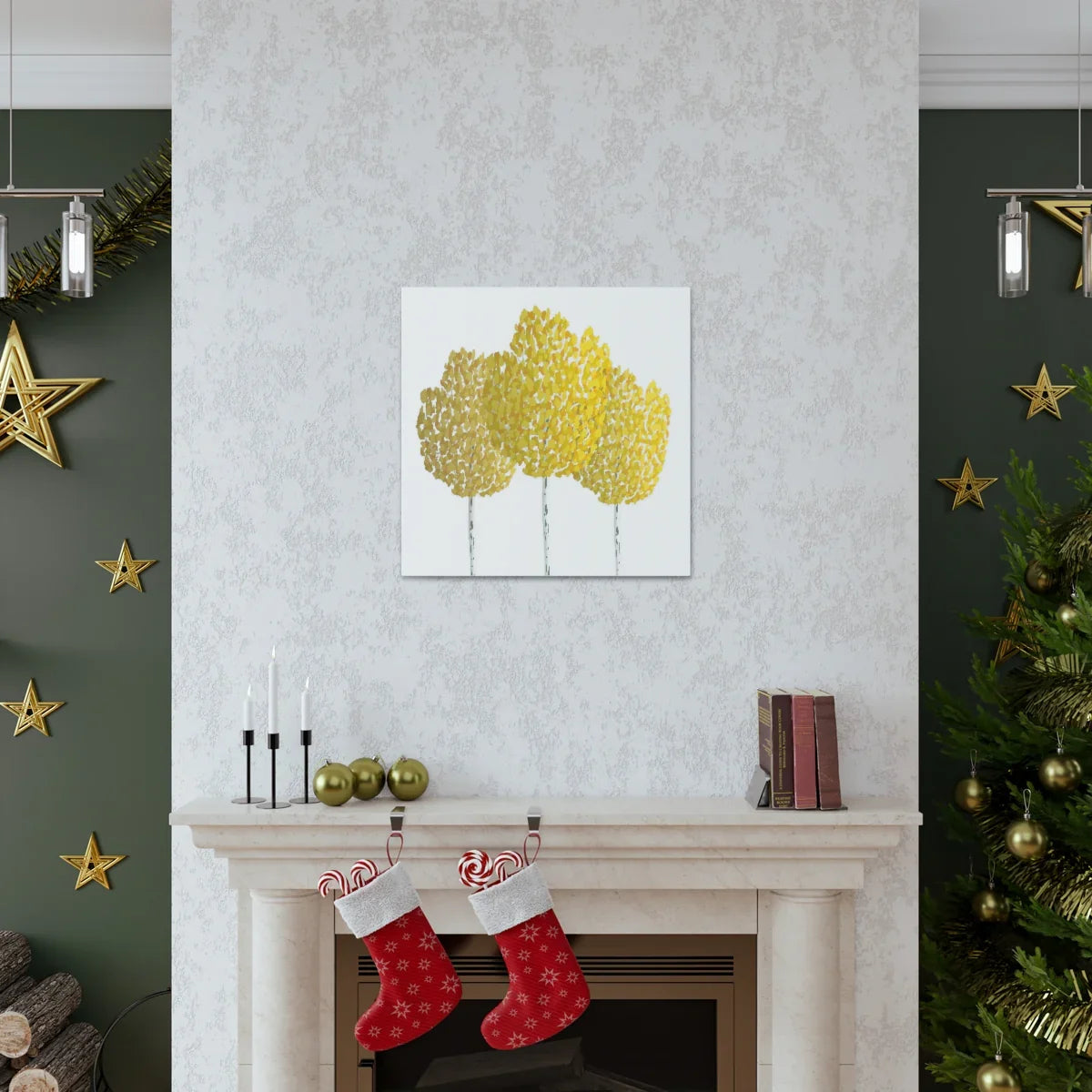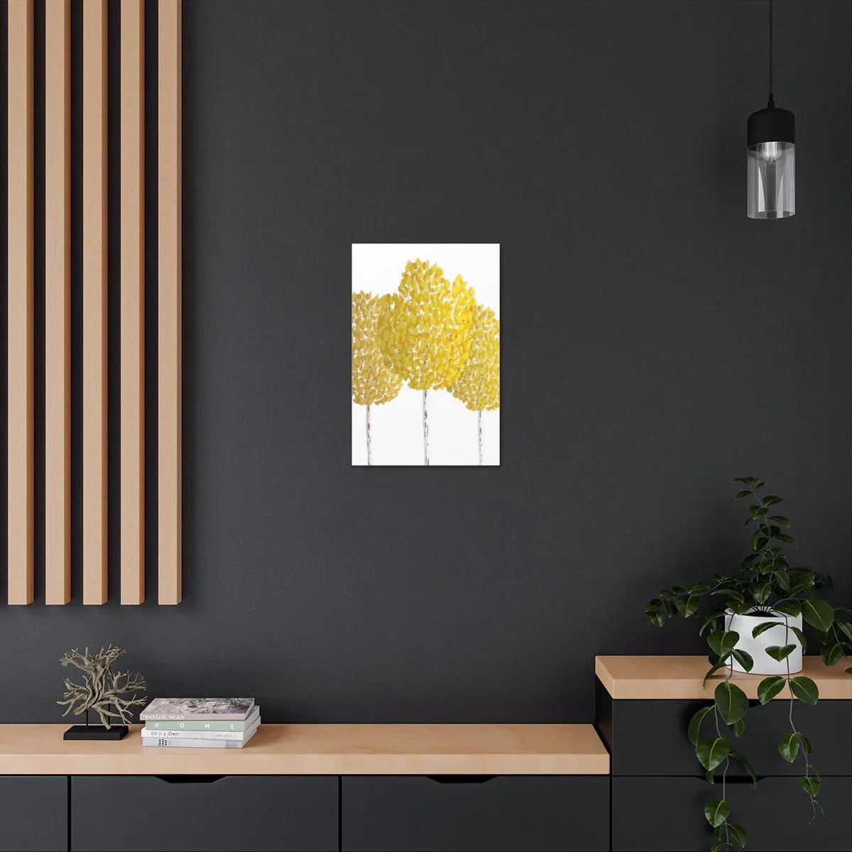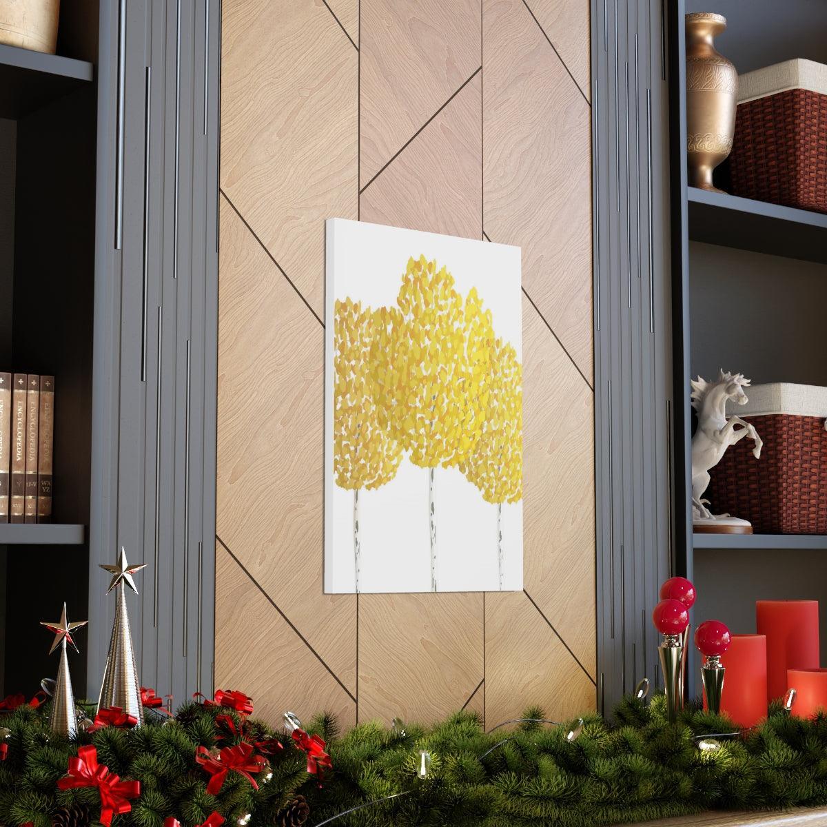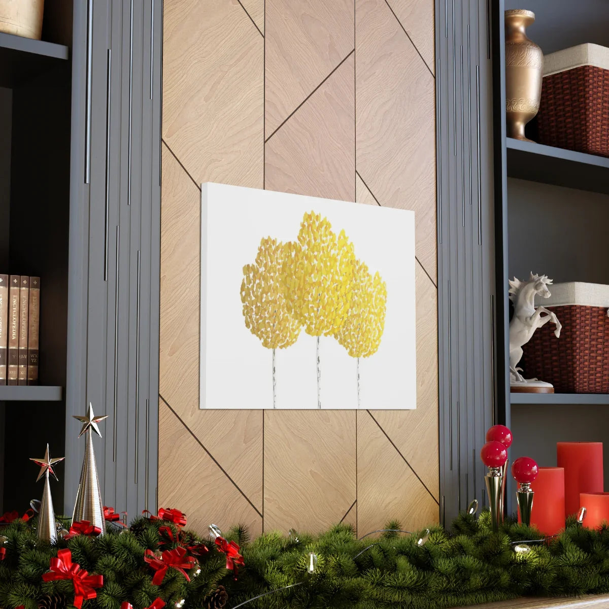 The Fall Aspen Canvas is a stunning stretched cotton canvas wall art featuring a vibrant yellow fall foliage print that captures the essence of quaking aspen trees. This indoor canvas decor brings nature wall decor into your home with vivid detail and artistic flair, created from hand-drawn designs by Laura Christine Photography. Measuring precisely to fit standard frames, this matte canvas painting offers a smooth surface that enhances the rich colors of the Populus tremuloides poster, making it an ideal piece for artistic home decor enthusiasts.