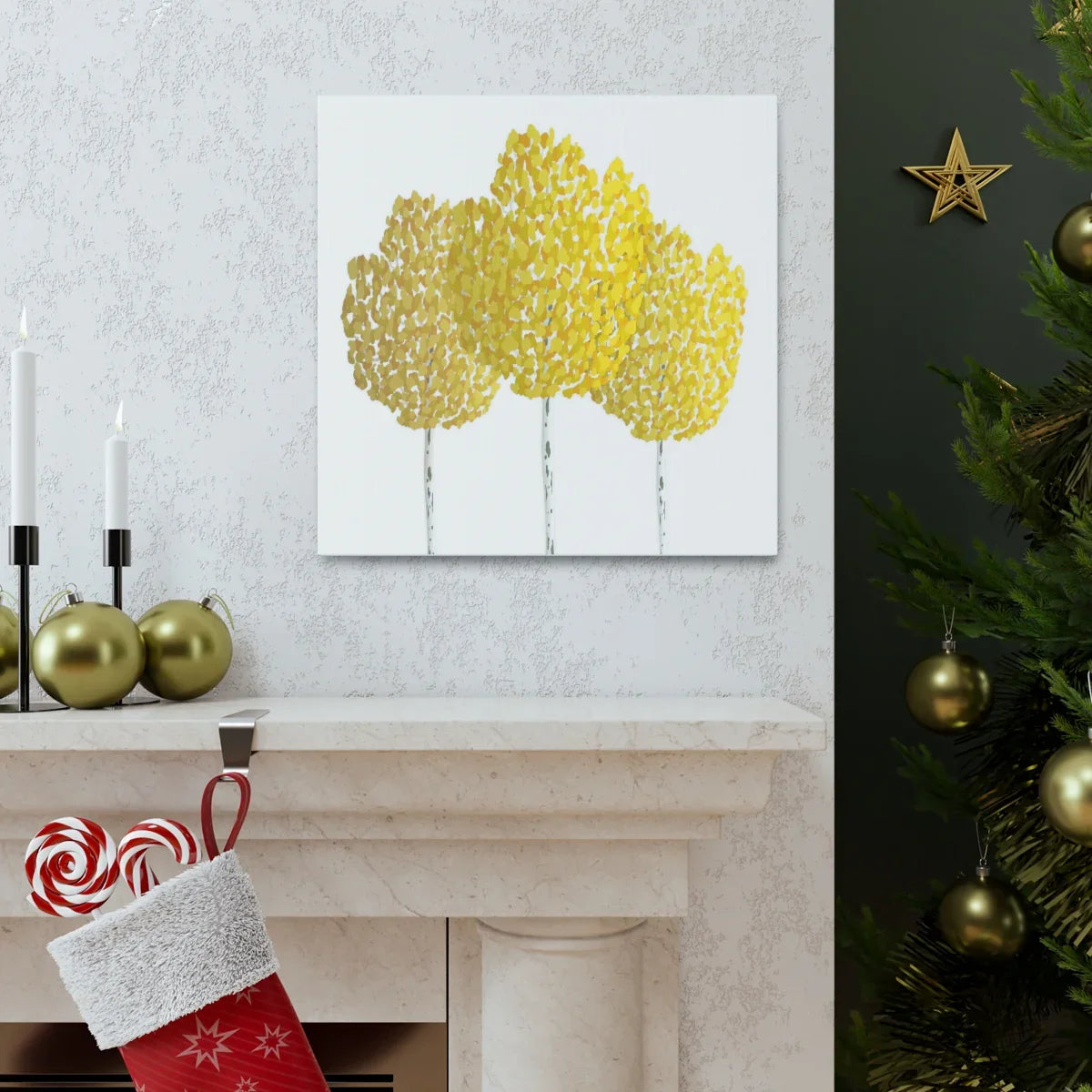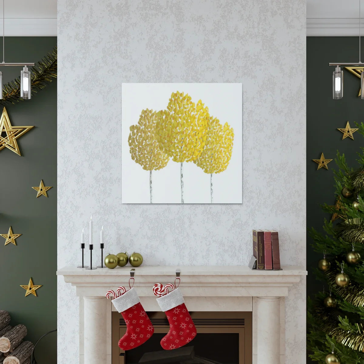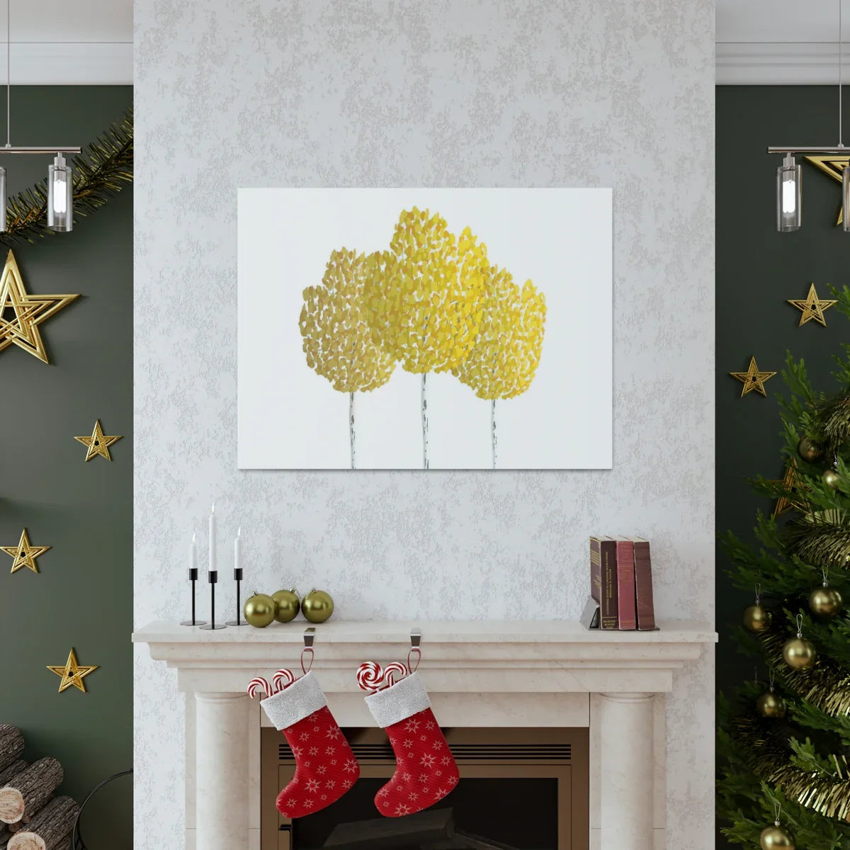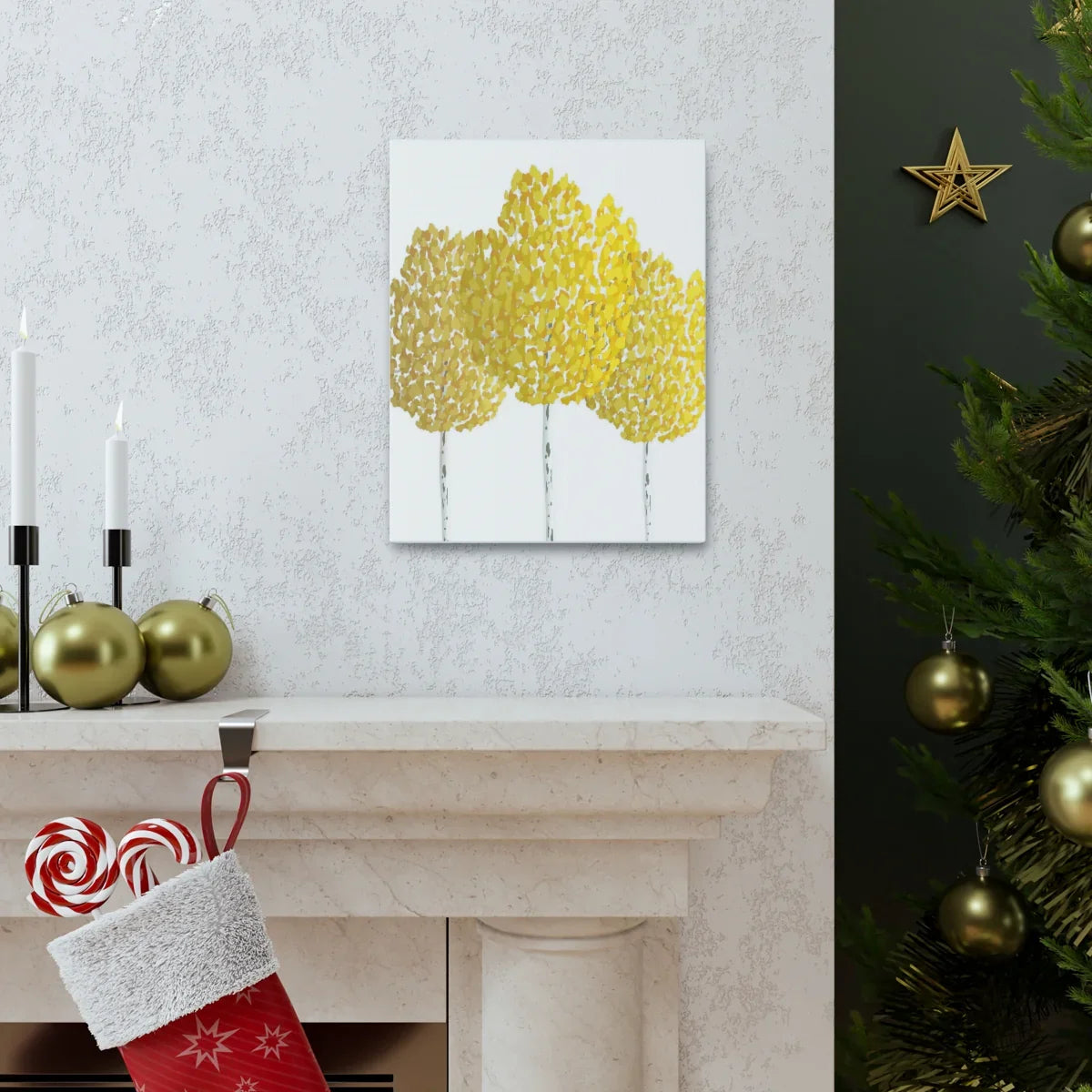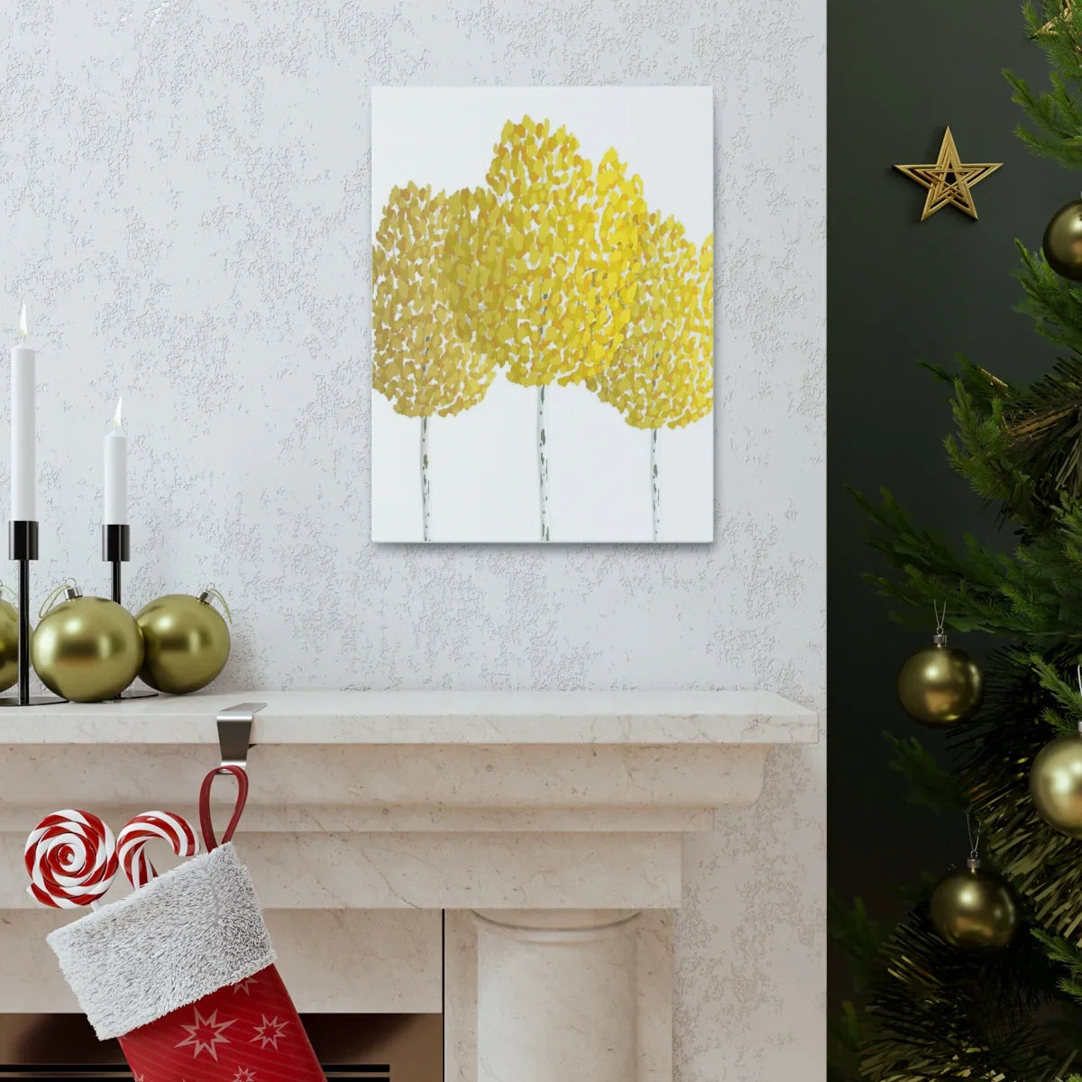 The Fall Aspen Canvas is a stunning stretched cotton canvas wall art featuring a vibrant yellow fall foliage print that captures the essence of quaking aspen trees. This indoor canvas decor brings nature wall decor into your home with vivid detail and artistic flair, created from hand-drawn designs by Laura Christine Photography. Measuring precisely to fit standard frames, this matte canvas painting offers a smooth surface that enhances the rich colors of the Populus tremuloides poster, making it an ideal piece for artistic home decor enthusiasts.