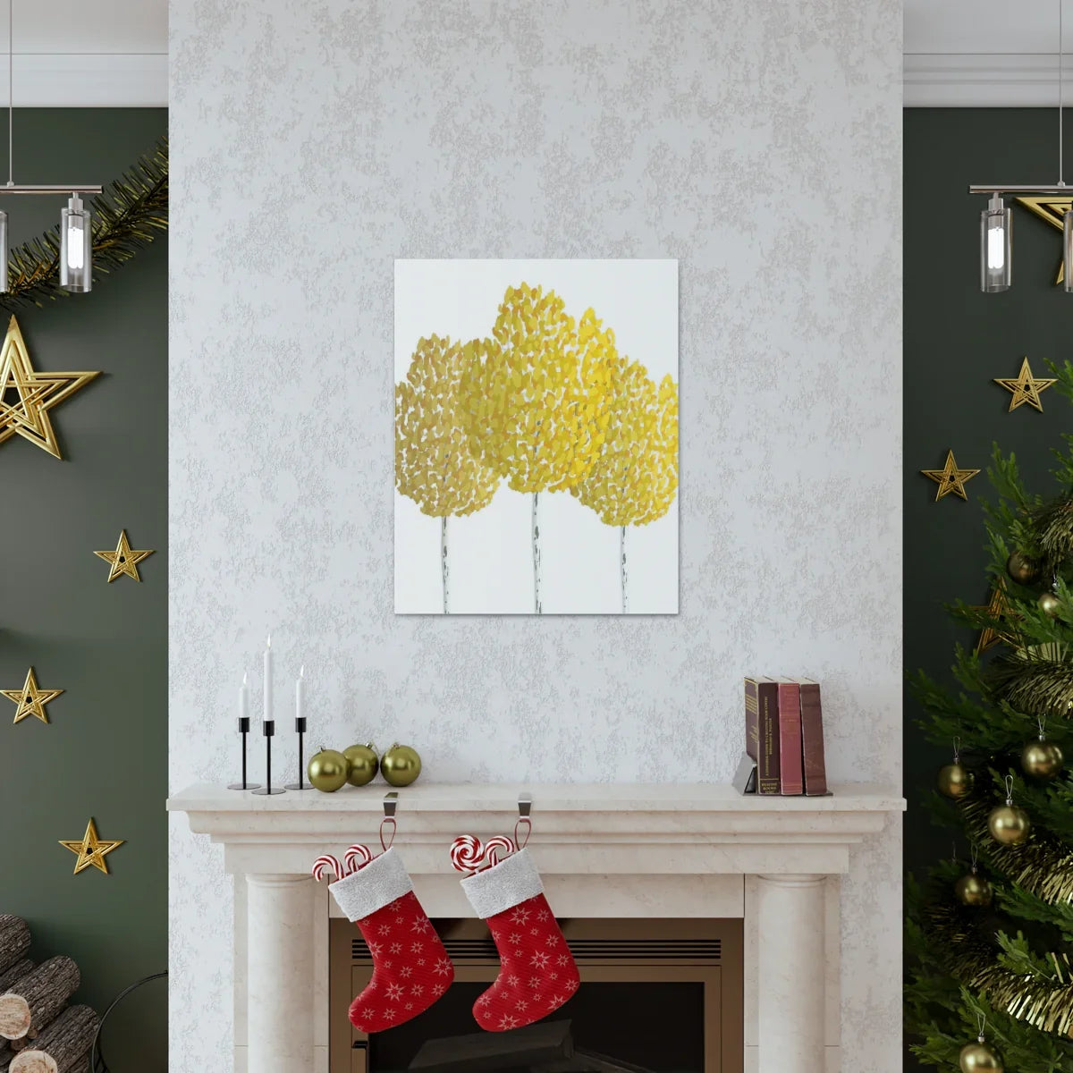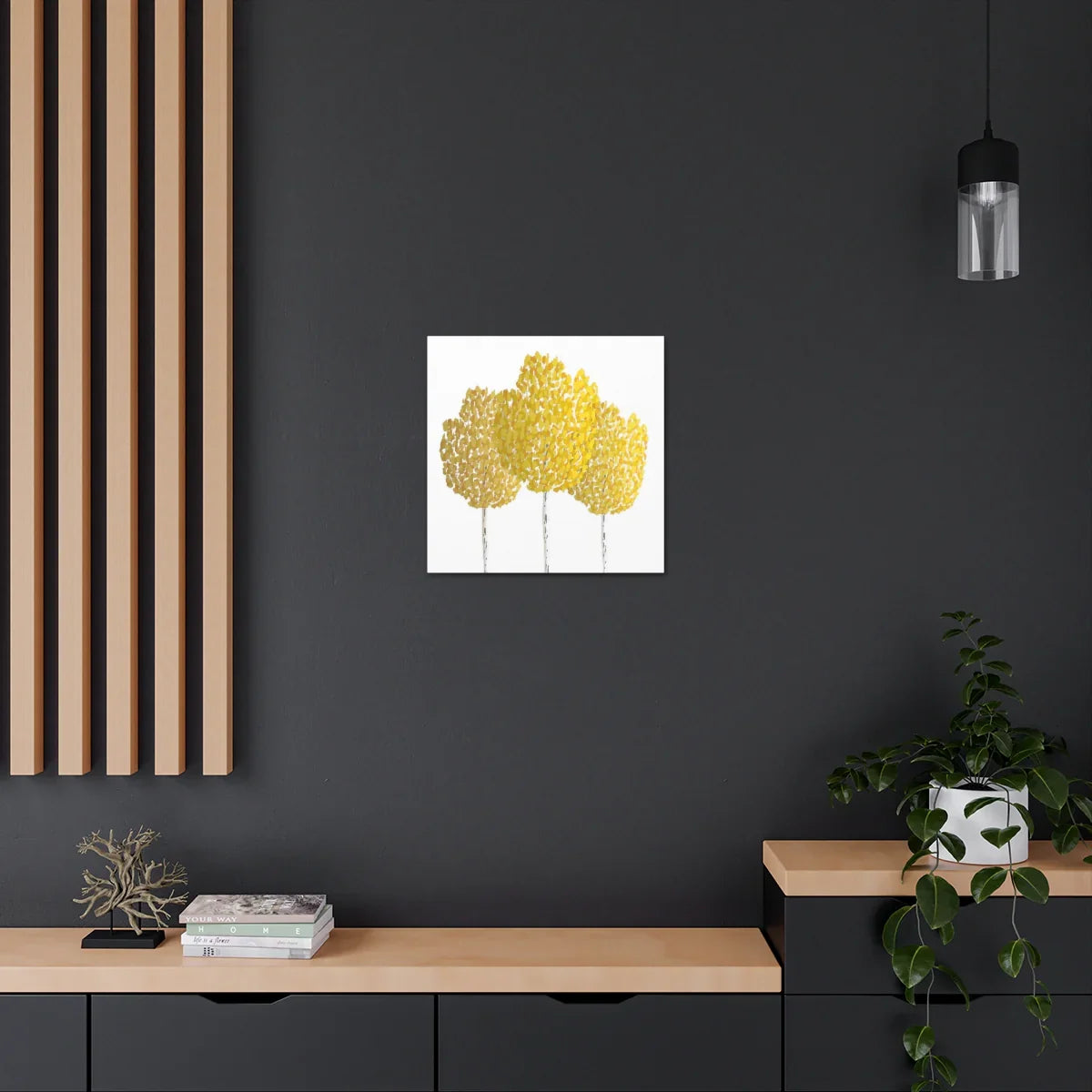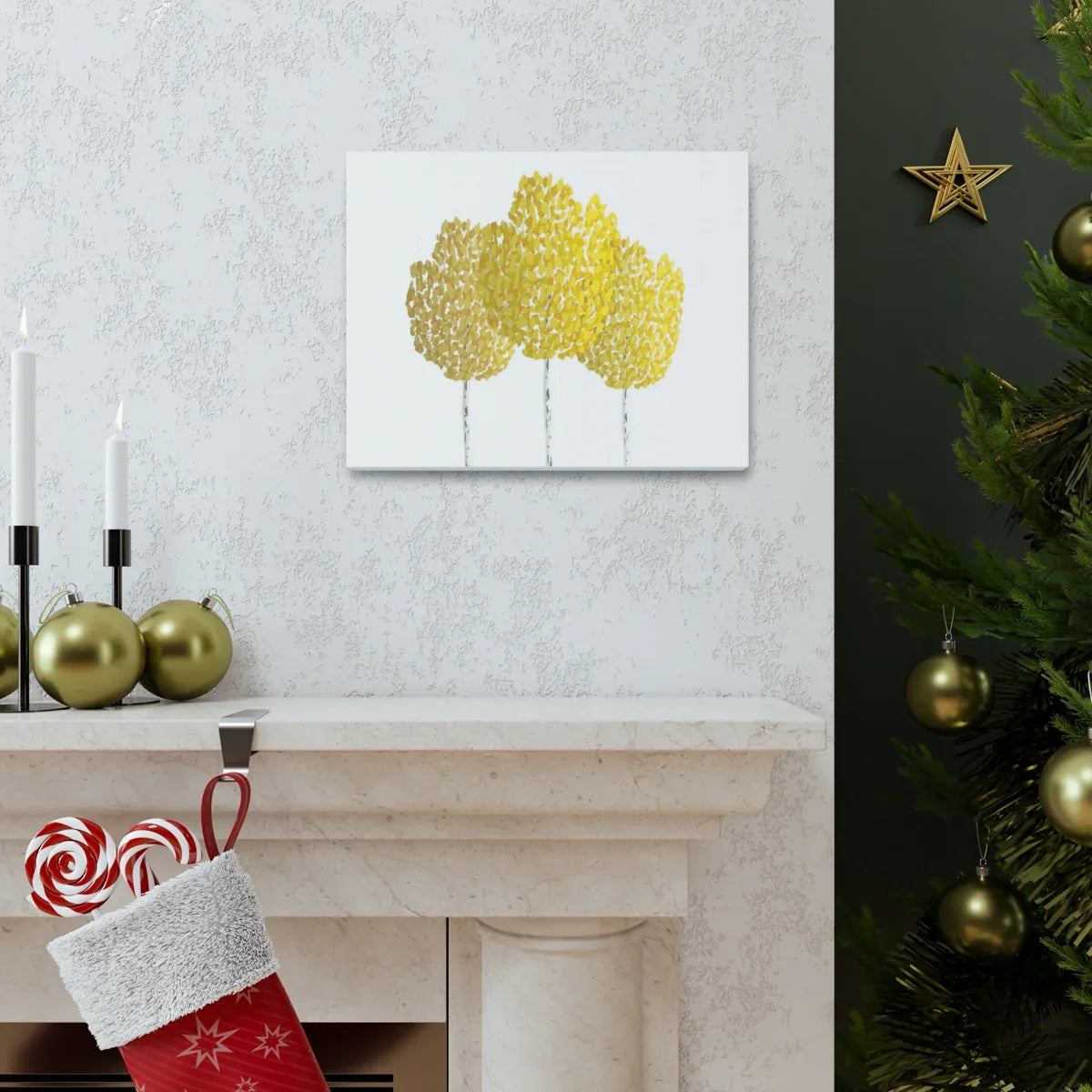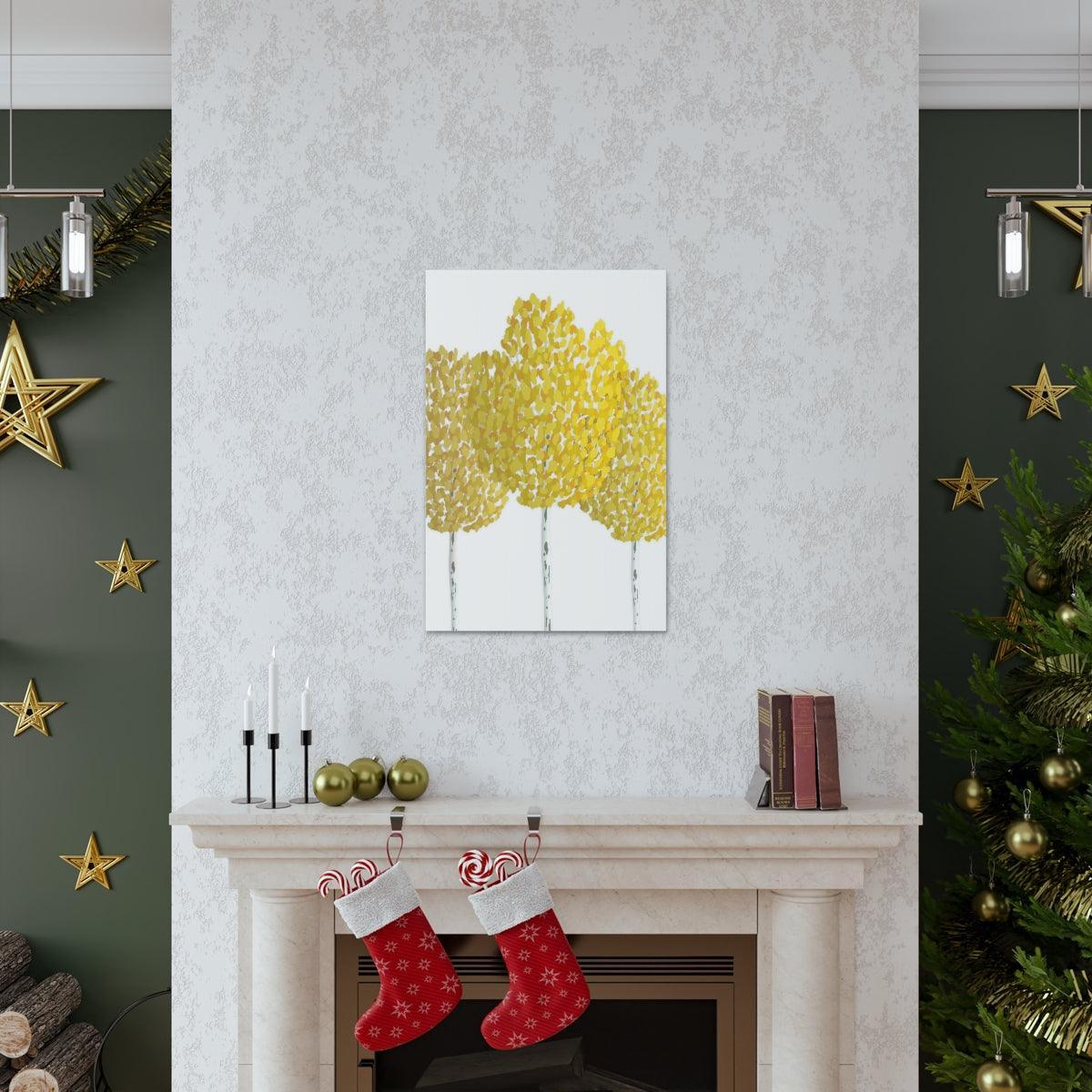 The Fall Aspen Canvas is a stunning stretched cotton canvas wall art featuring a vibrant yellow fall foliage print that captures the essence of quaking aspen trees. This indoor canvas decor brings nature wall decor into your home with vivid detail and artistic flair, created from hand-drawn designs by Laura Christine Photography. Measuring precisely to fit standard frames, this matte canvas painting offers a smooth surface that enhances the rich colors of the Populus tremuloides poster, making it an ideal piece for artistic home decor enthusiasts.