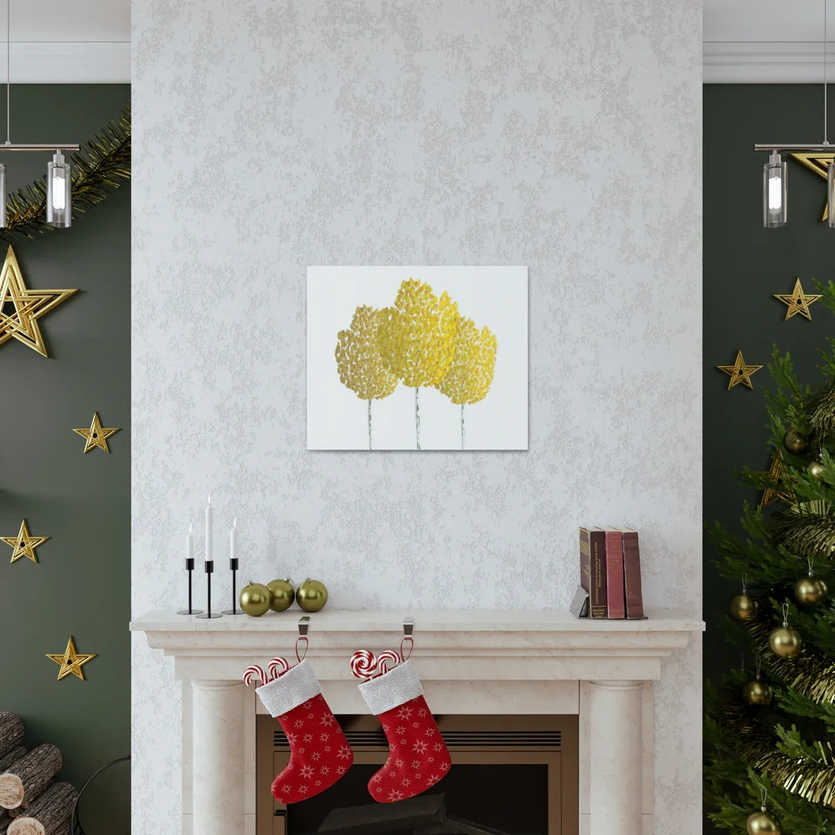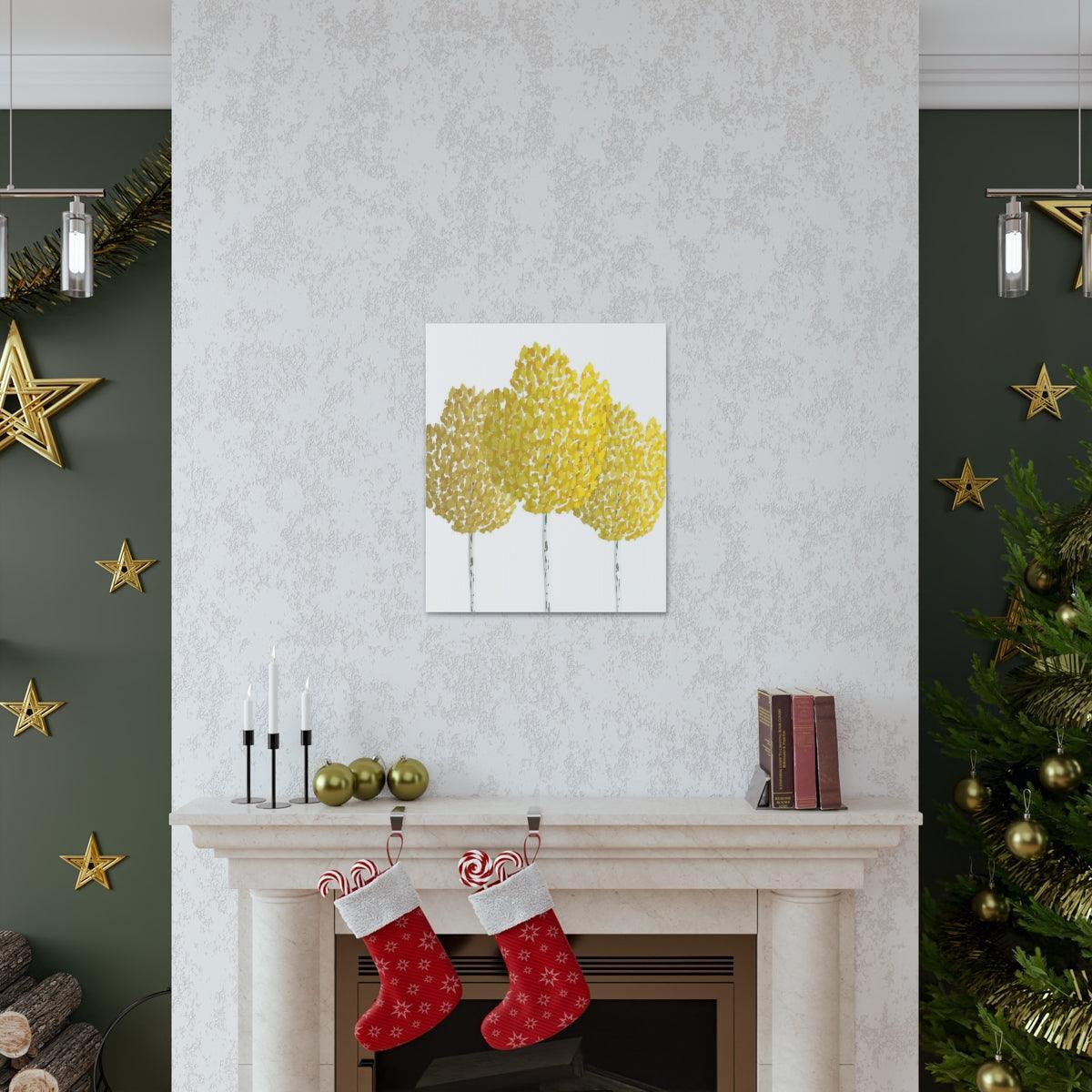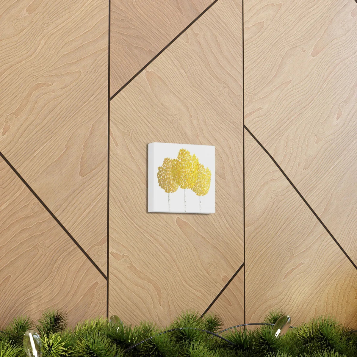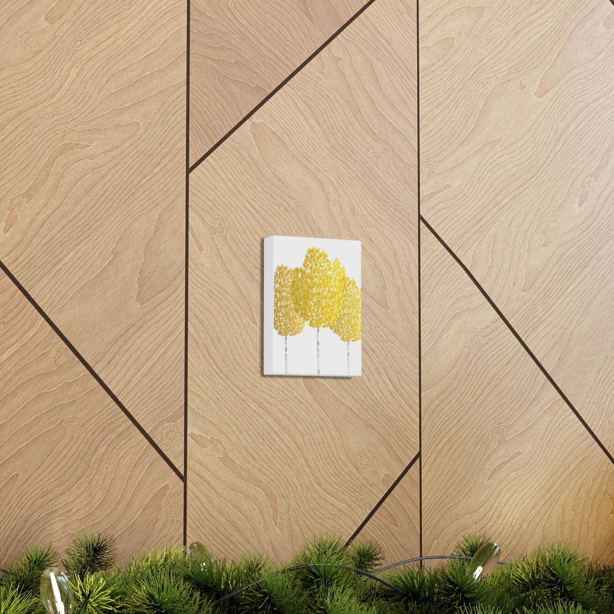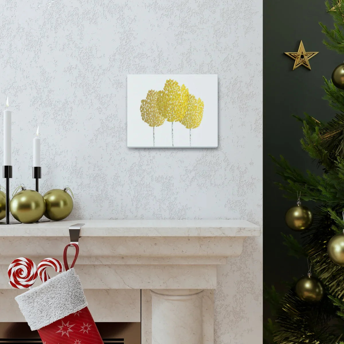 The Fall Aspen Canvas is a stunning stretched cotton canvas wall art featuring a vibrant yellow fall foliage print that captures the essence of quaking aspen trees. This indoor canvas decor brings nature wall decor into your home with vivid detail and artistic flair, created from hand-drawn designs by Laura Christine Photography. Measuring precisely to fit standard frames, this matte canvas painting offers a smooth surface that enhances the rich colors of the Populus tremuloides poster, making it an ideal piece for artistic home decor enthusiasts.
